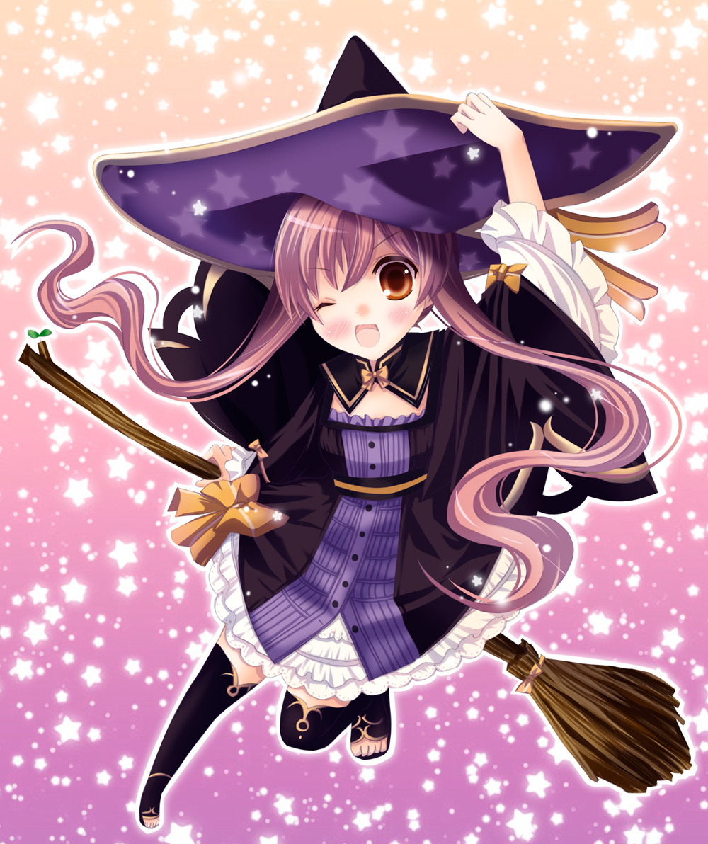 Description: A girl in a witches costume flying through the air with a broom and a hat on her head.