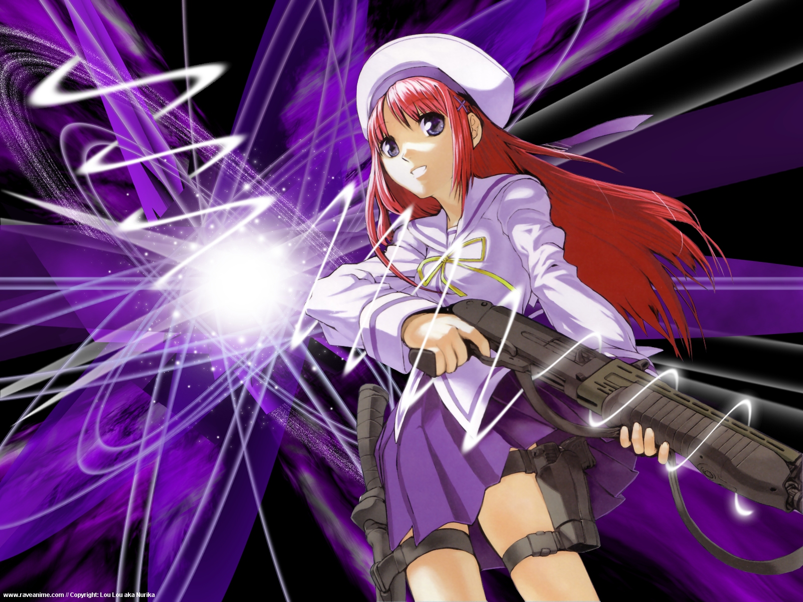 Description: A girl with a gun in her hand and a purple background with stars and lines around her.