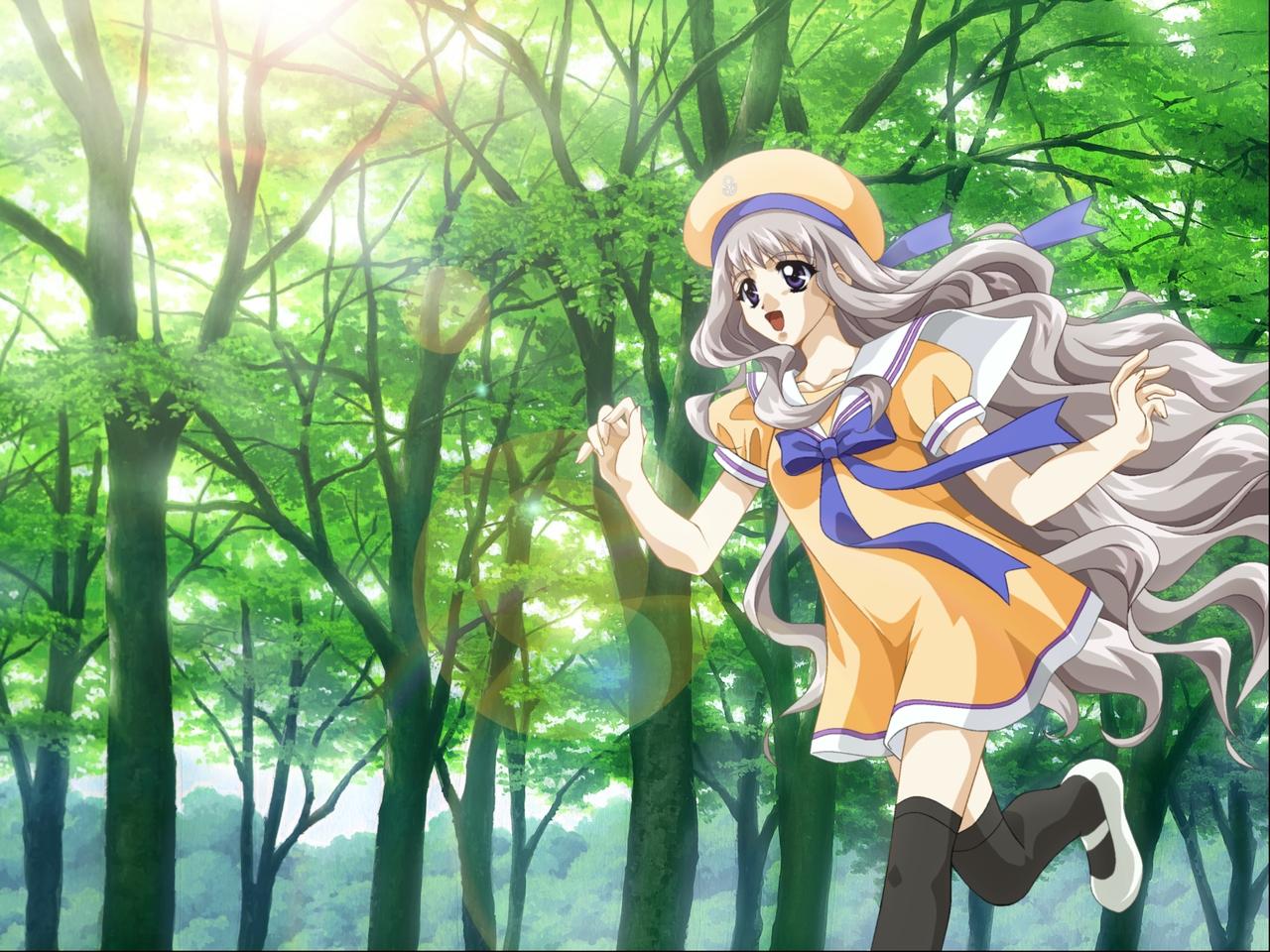 Description: A girl in a yellow dress and hat in a forest with trees and sunlight shining through the trees behind her.