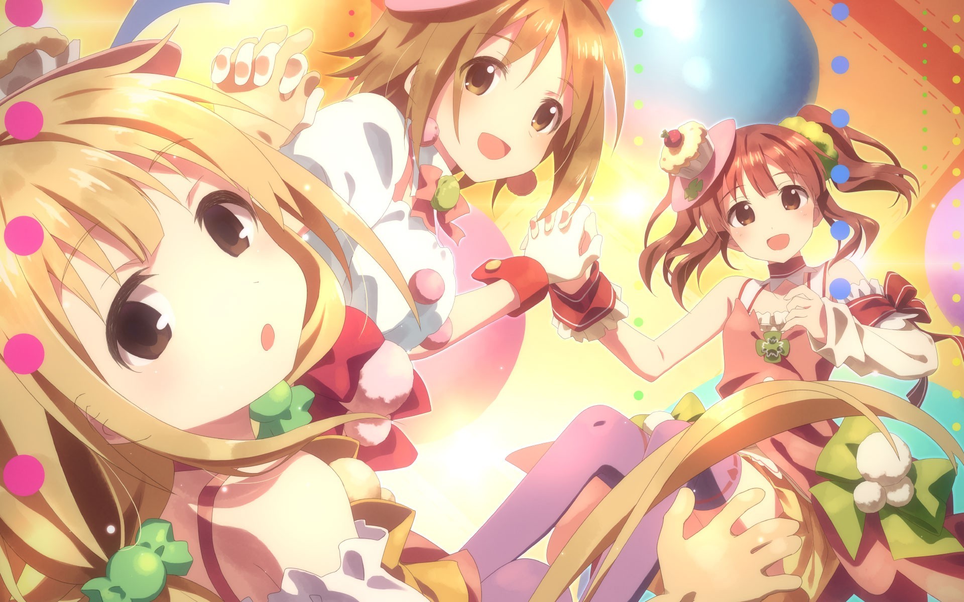 Description: A group of girls standing next to each other in front of balloons and balloons on a wall with a sky background.