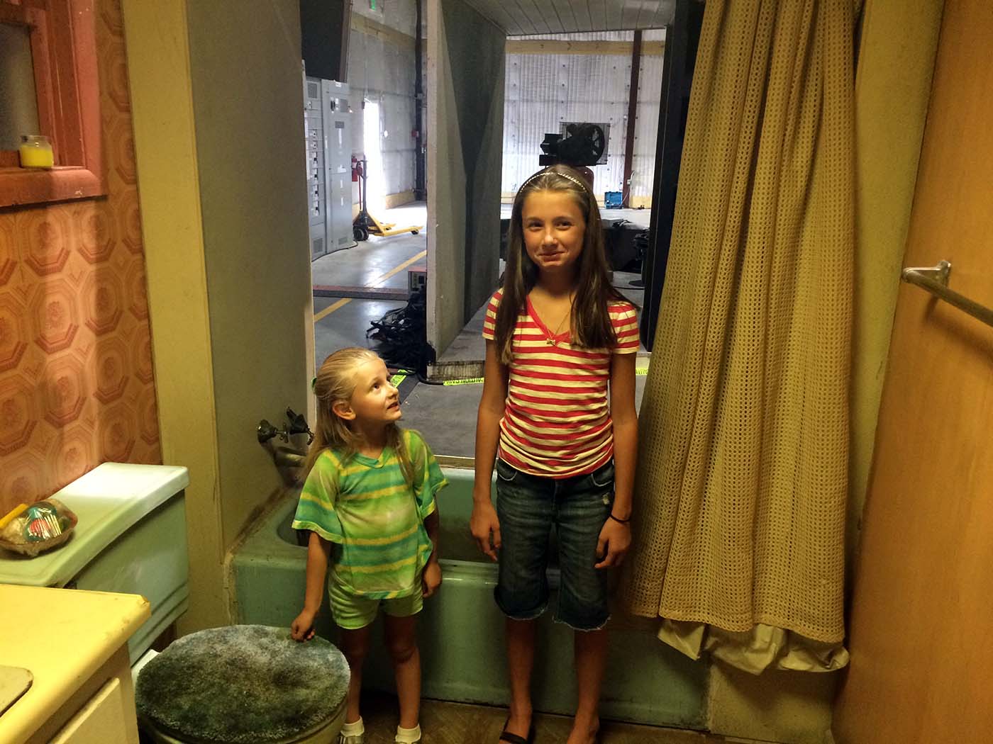 Description: Two little girls standing in a bathroom next to a window with curtains on it and a toilet in the background.