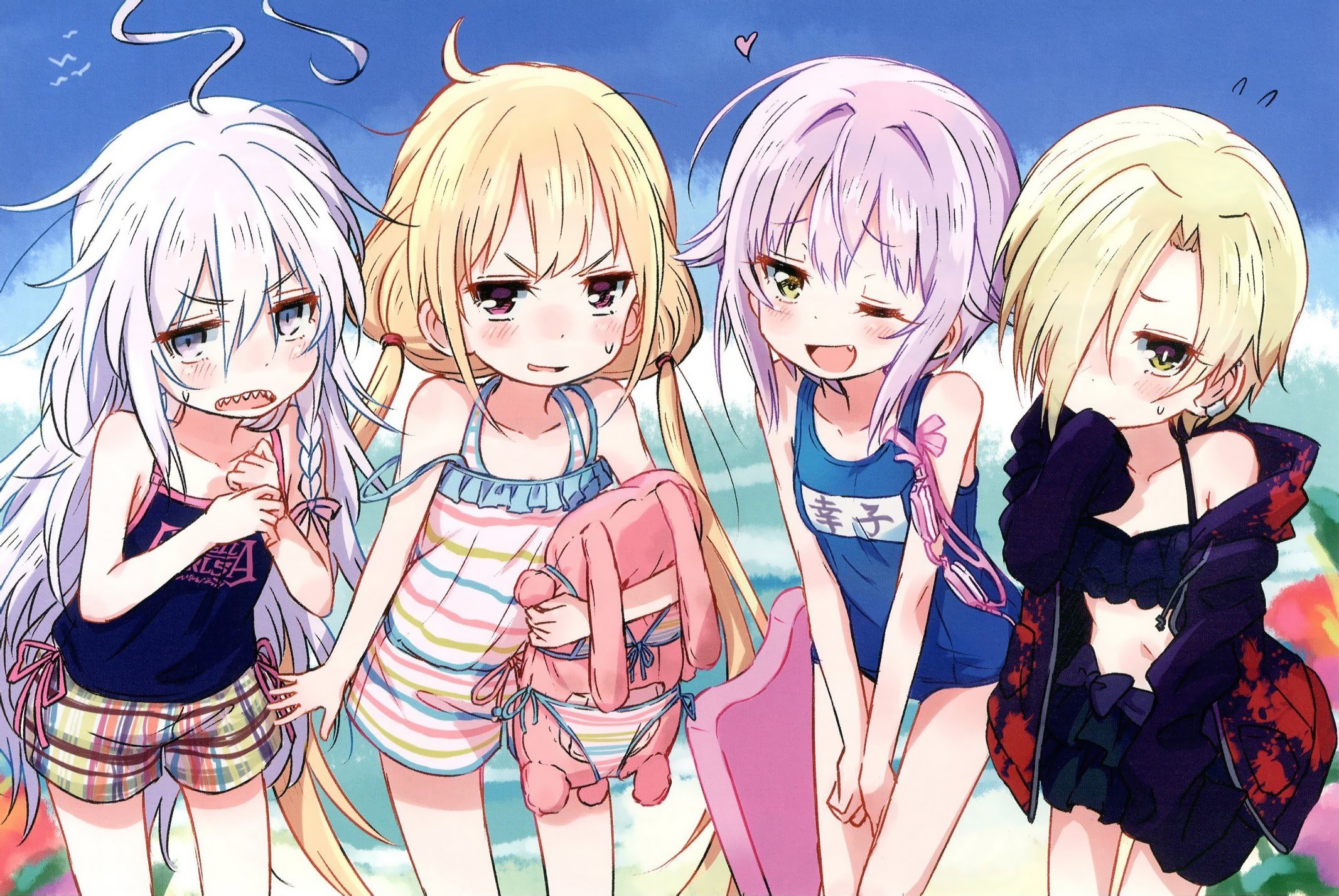 Description: A group of girls standing next to each other on a beach with a sky background and clouds in the background.