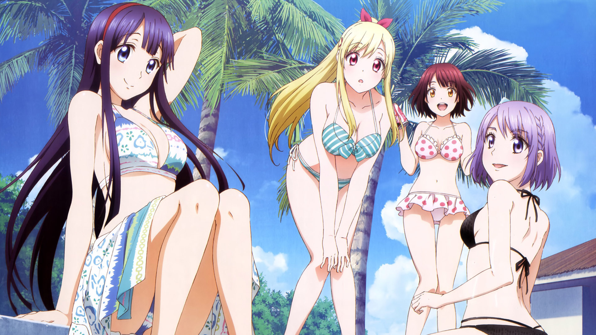 Description: Three girls in bikinis are sitting on a wall next to a palm tree and a building with a blue sky in the background.