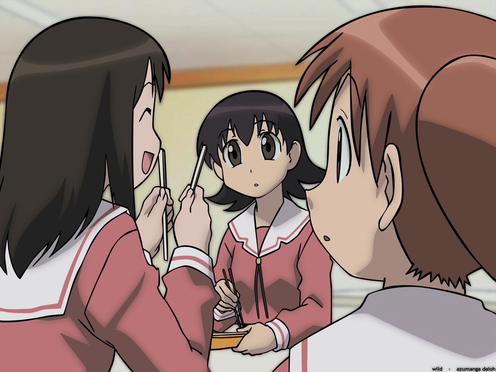 Description: A group of girls standing around each other in a room with a mirror on the wall and one girl brushing her teeth.