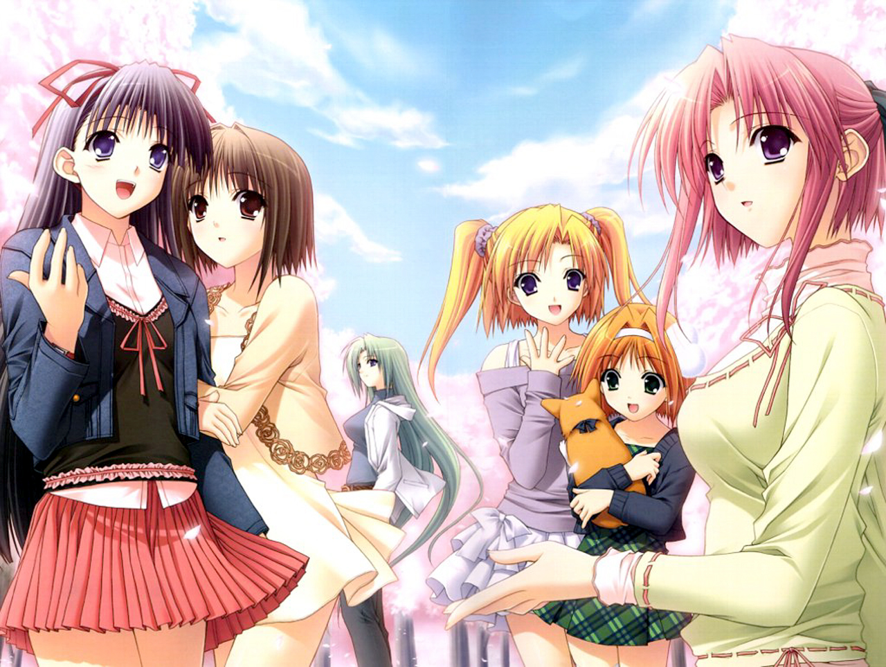 Description: A group of girls standing next to each other in front of a sky with clouds and stars in it.