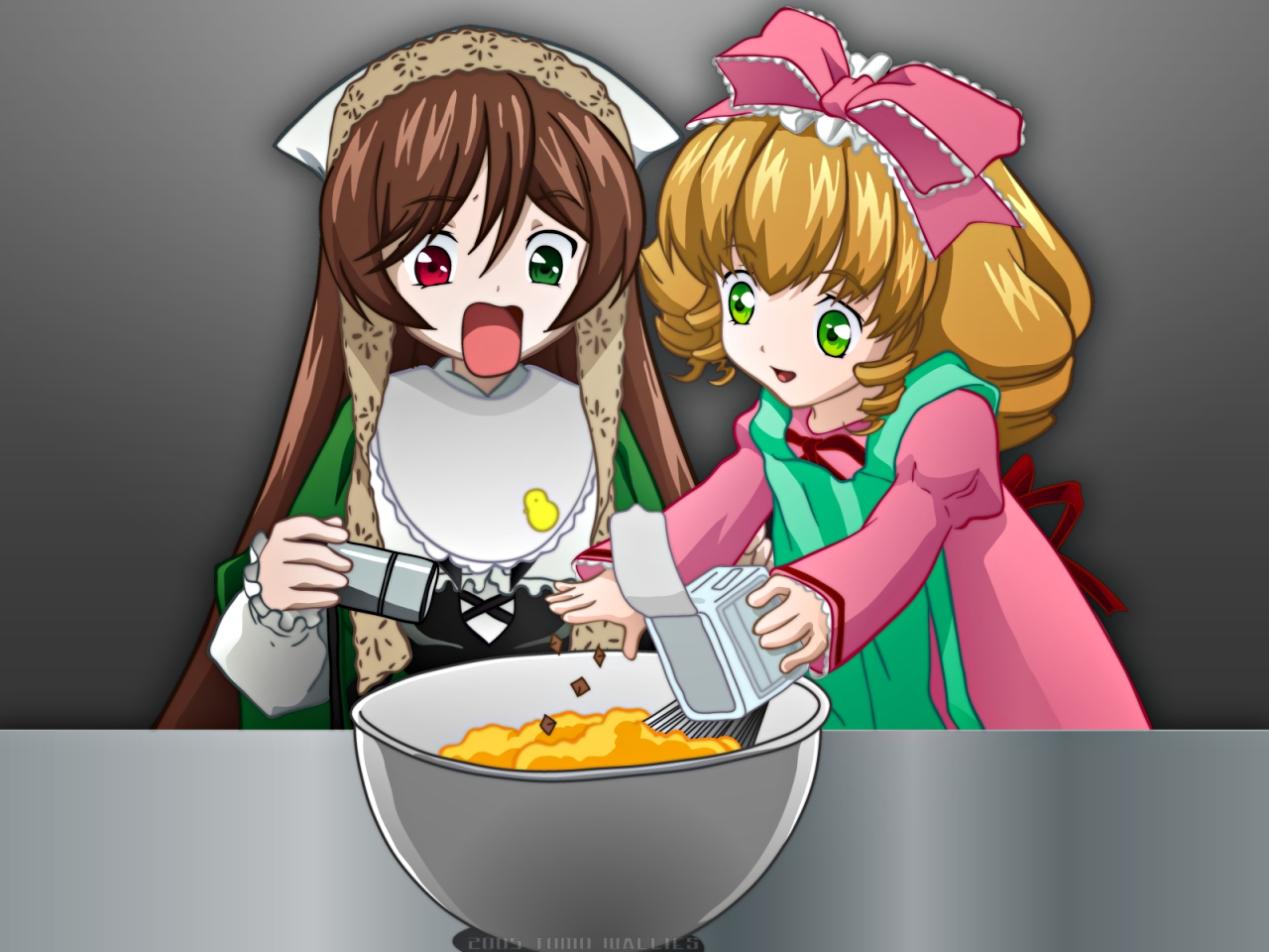 Description: Two girls in costumes are making a mess together in a bowl of food.