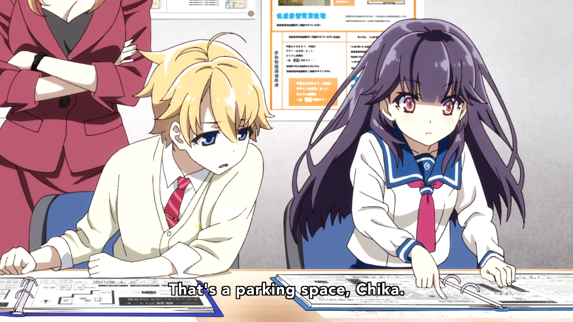 Description: Two girls sitting at a desk with a computer in front of them and a man standing behind them with a laptop.