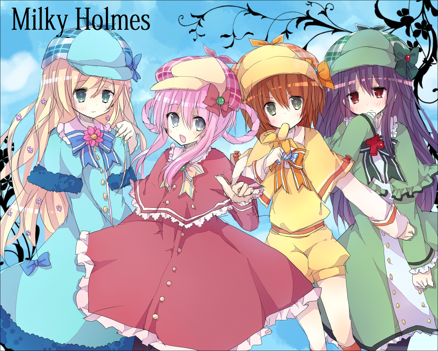 Description: A group of girls in dresses and hats standing next to each other in front of a blue sky with clouds.