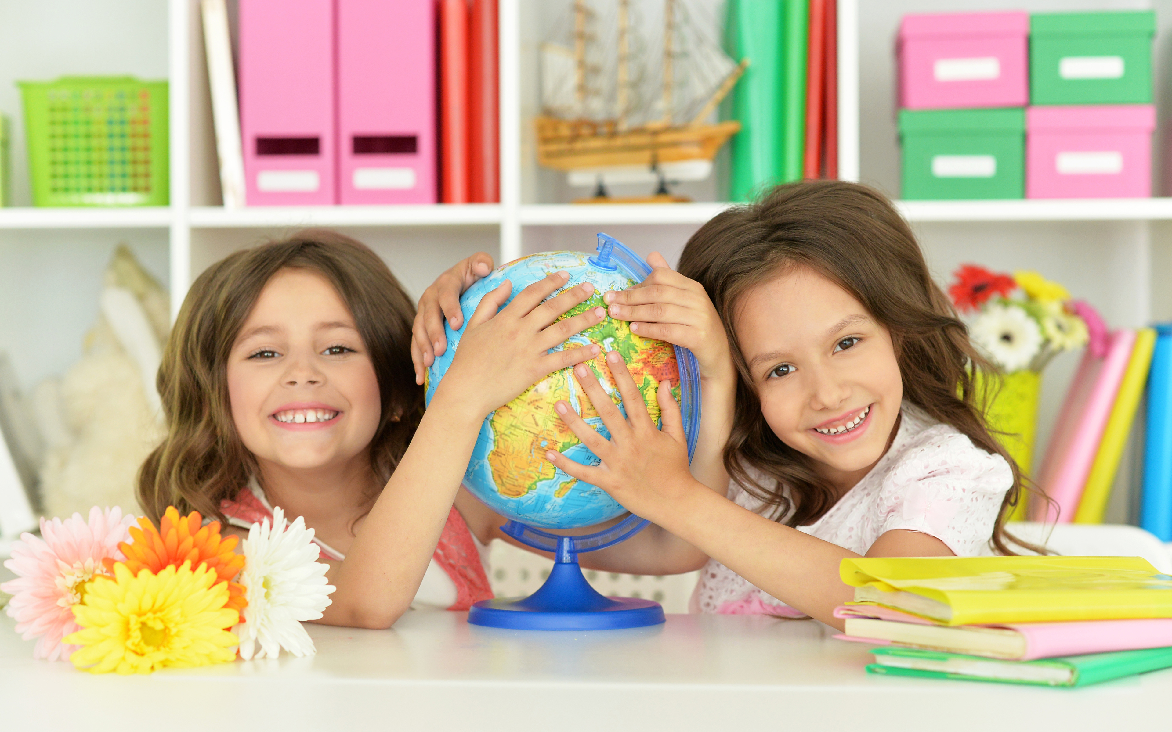 Description: Two girls are holding a globe in front of them on a table with books and a flower in front of them.