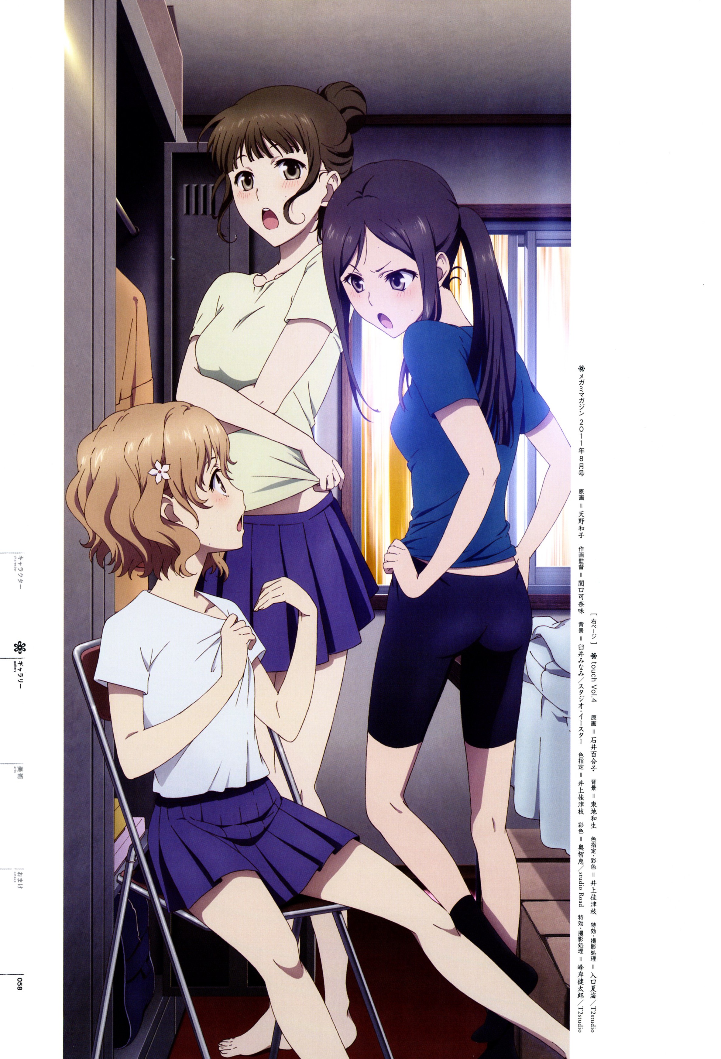 Description: A group of girls standing around each other in a room with a door open and a window open to the other side.