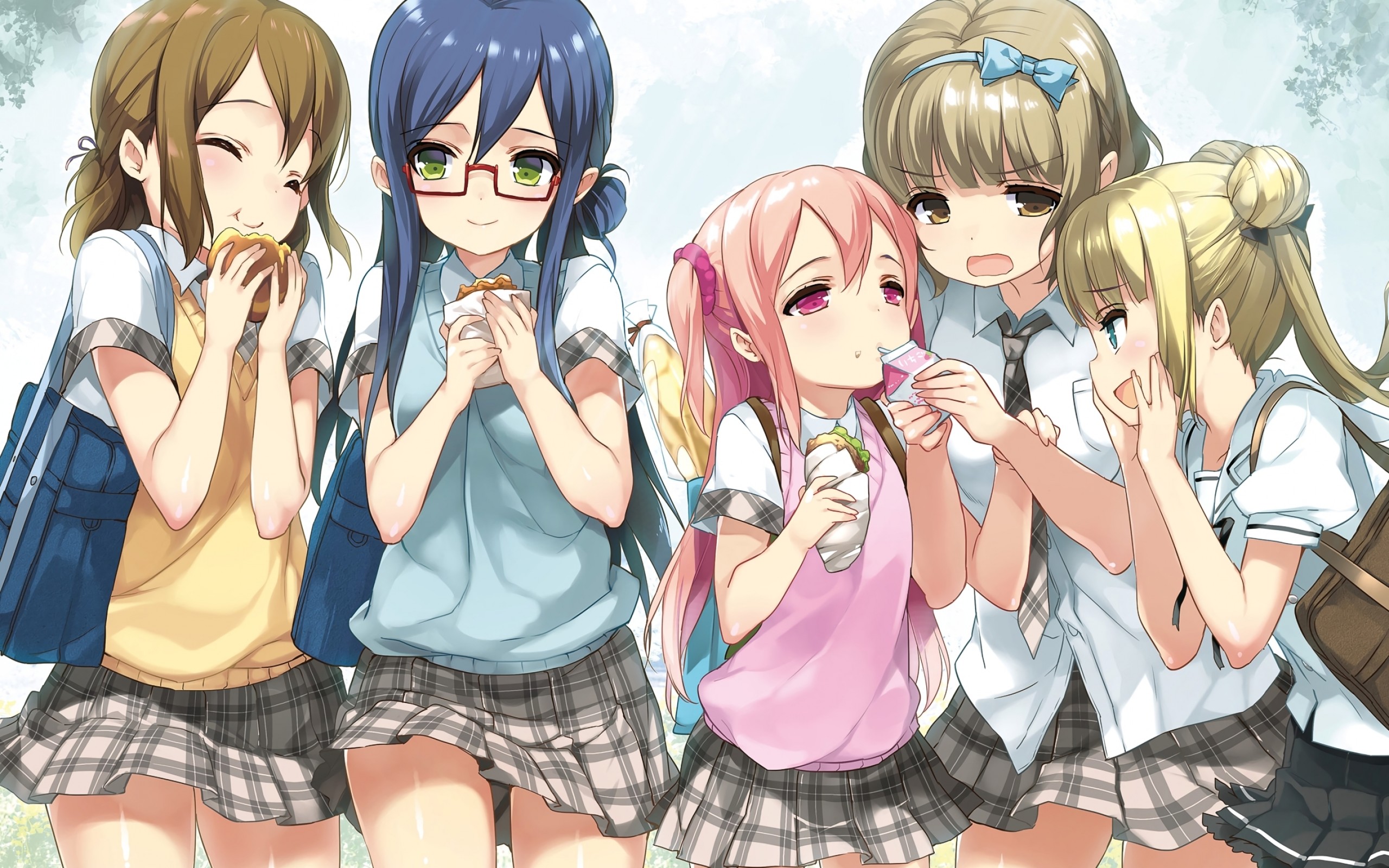 Description: A group of girls standing next to each other in front of a tree and a building with a clock on it.