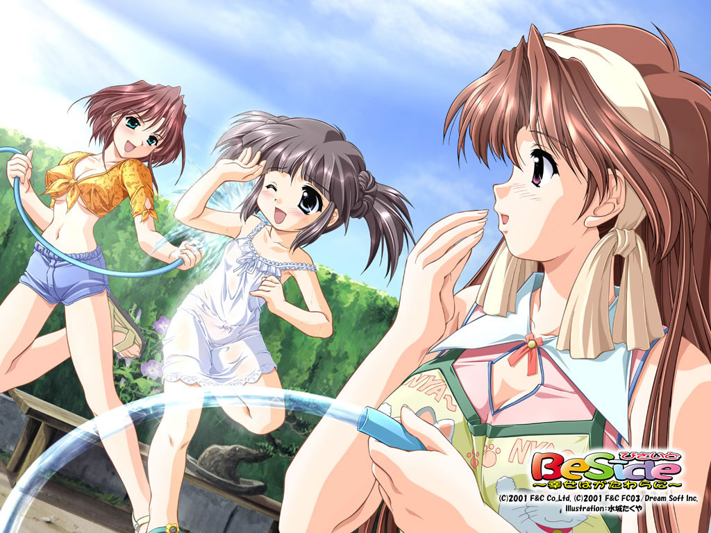 Description: A group of girls standing next to each other in front of a blue sky and trees with a hula hoop.