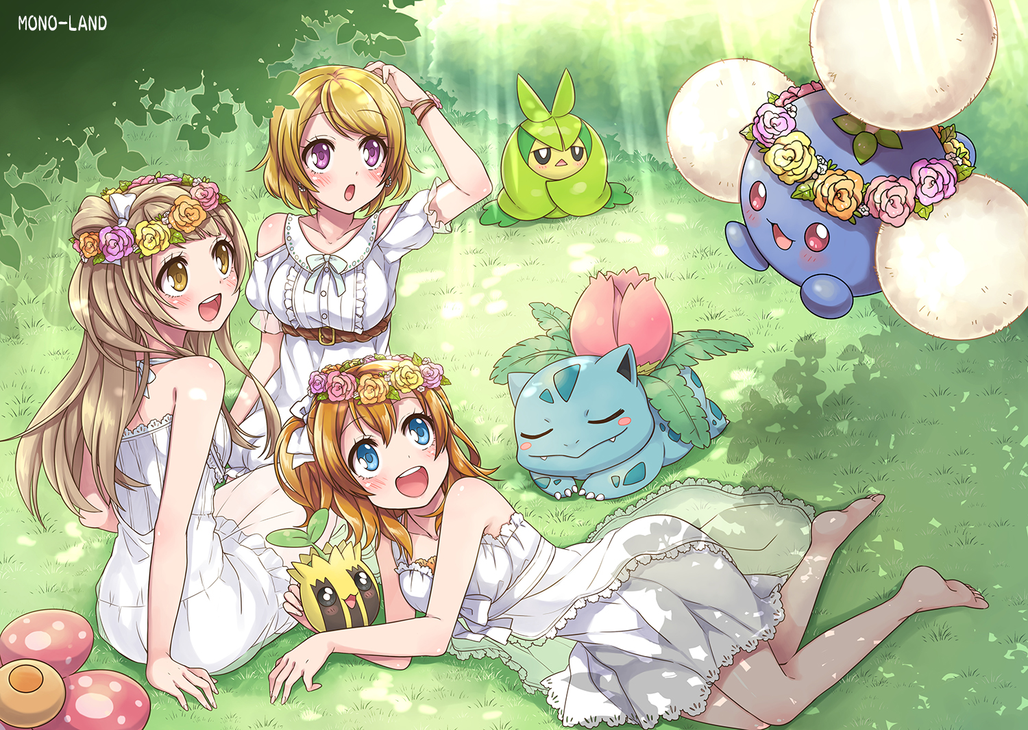 Description: A group of girls laying on the ground next to a pokemon stuffed animal and a balloon with a girl on it.