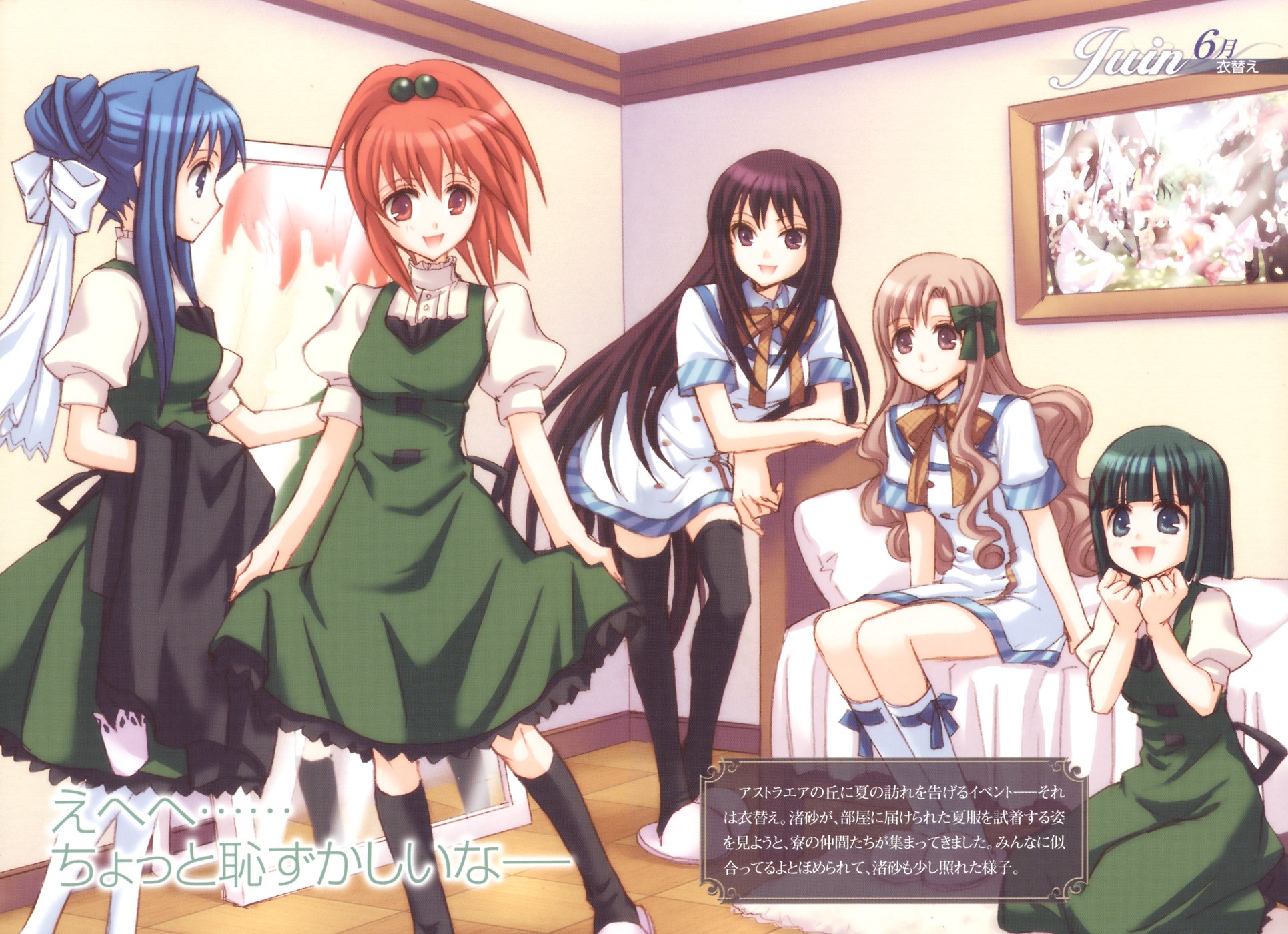 Description: A group of girls in a room with a table and chairs in front of them and a wall with pictures on it.