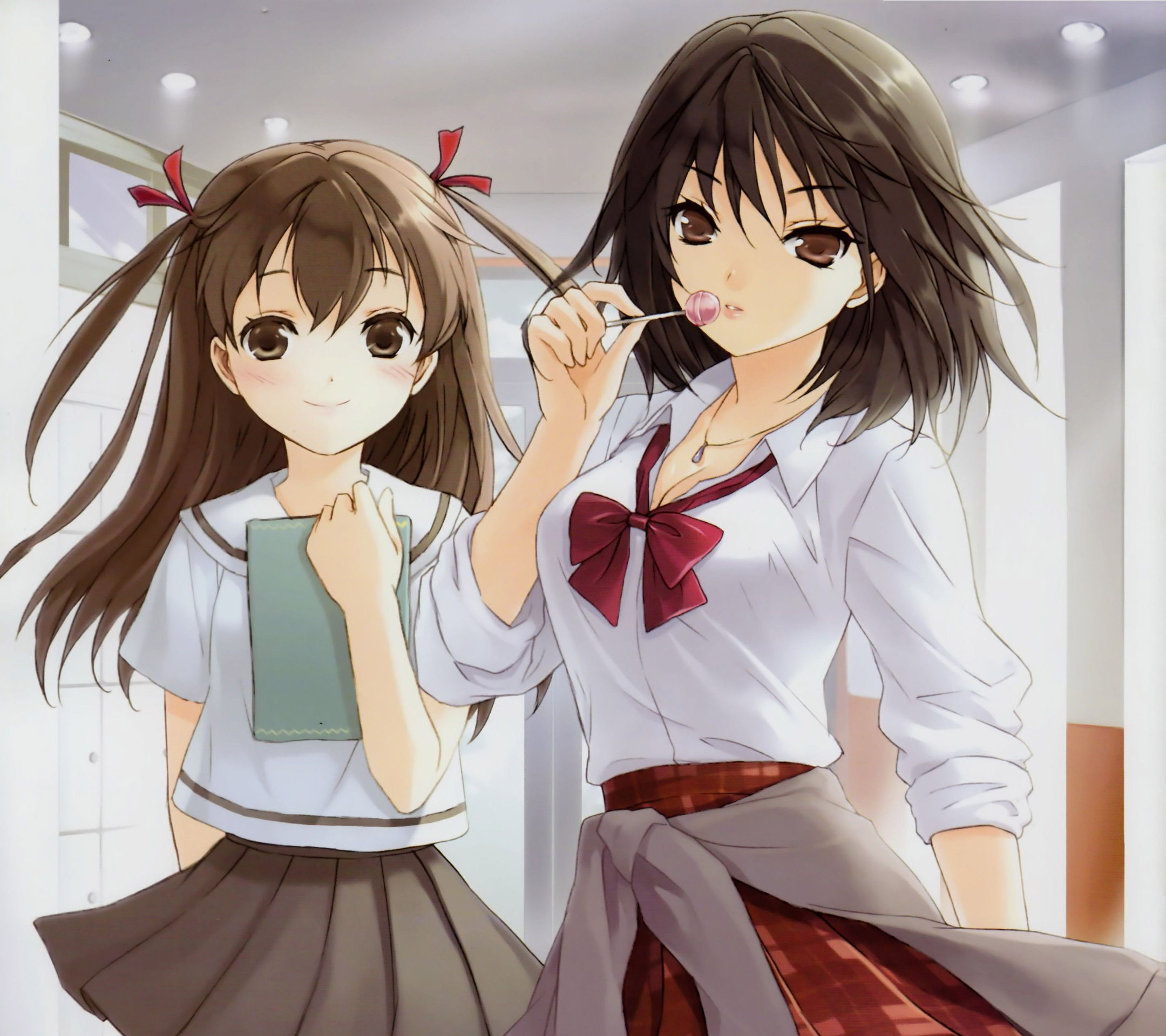 Description: Two girls in school uniforms are brushing their teeth together in a room with lights on the ceiling and a mirror behind them.