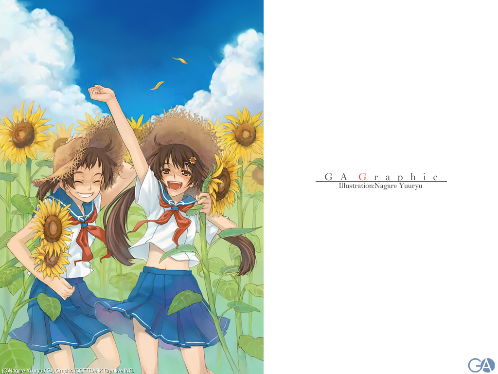 Description: Two girls in school uniforms are standing in a field of sunflowers and one girl is raising her arms.