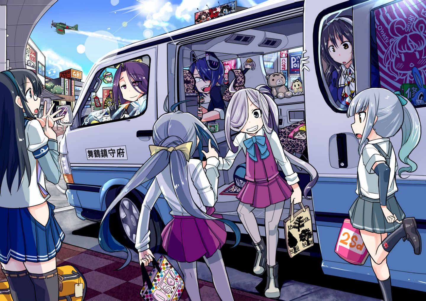 Description: A group of girls standing next to a van with a bunch of stuffed animals on it's roof.