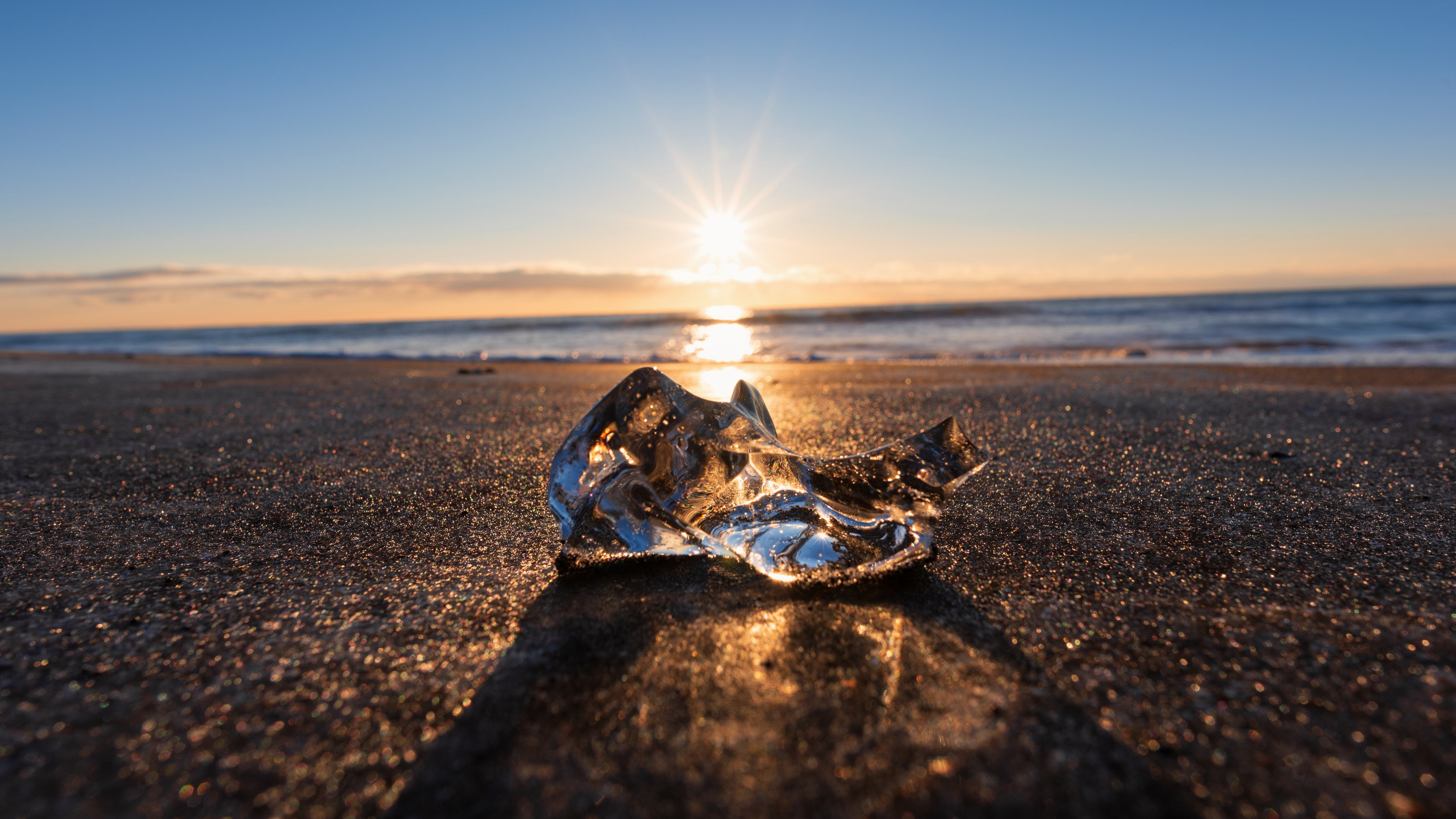 Description: A piece of glass sitting on top of a sandy beach next to the ocean at sunset or sunrise time.