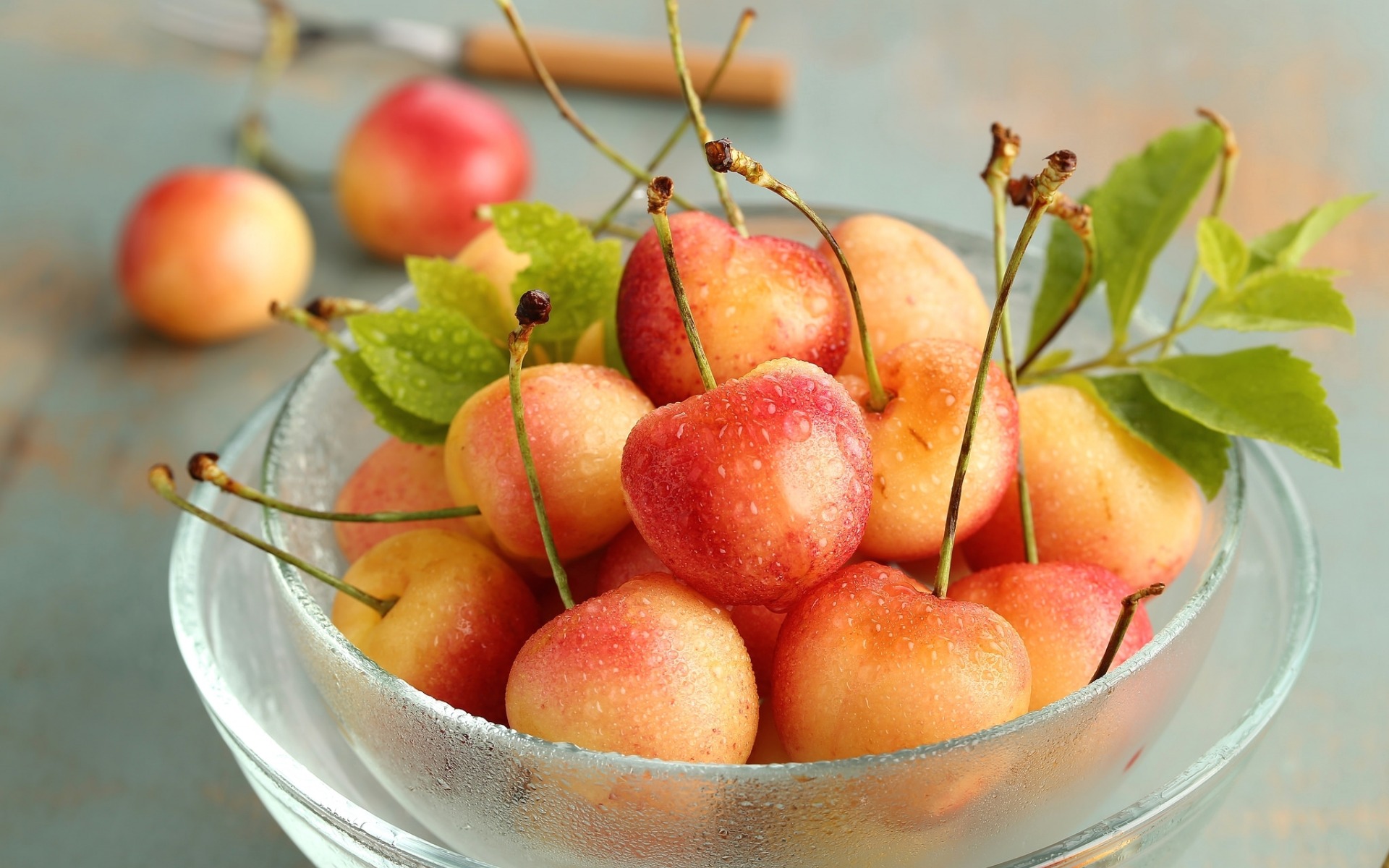 Description: A glass bowl filled with lots of fruit on top of a table next to a knife and fork and a spoon.