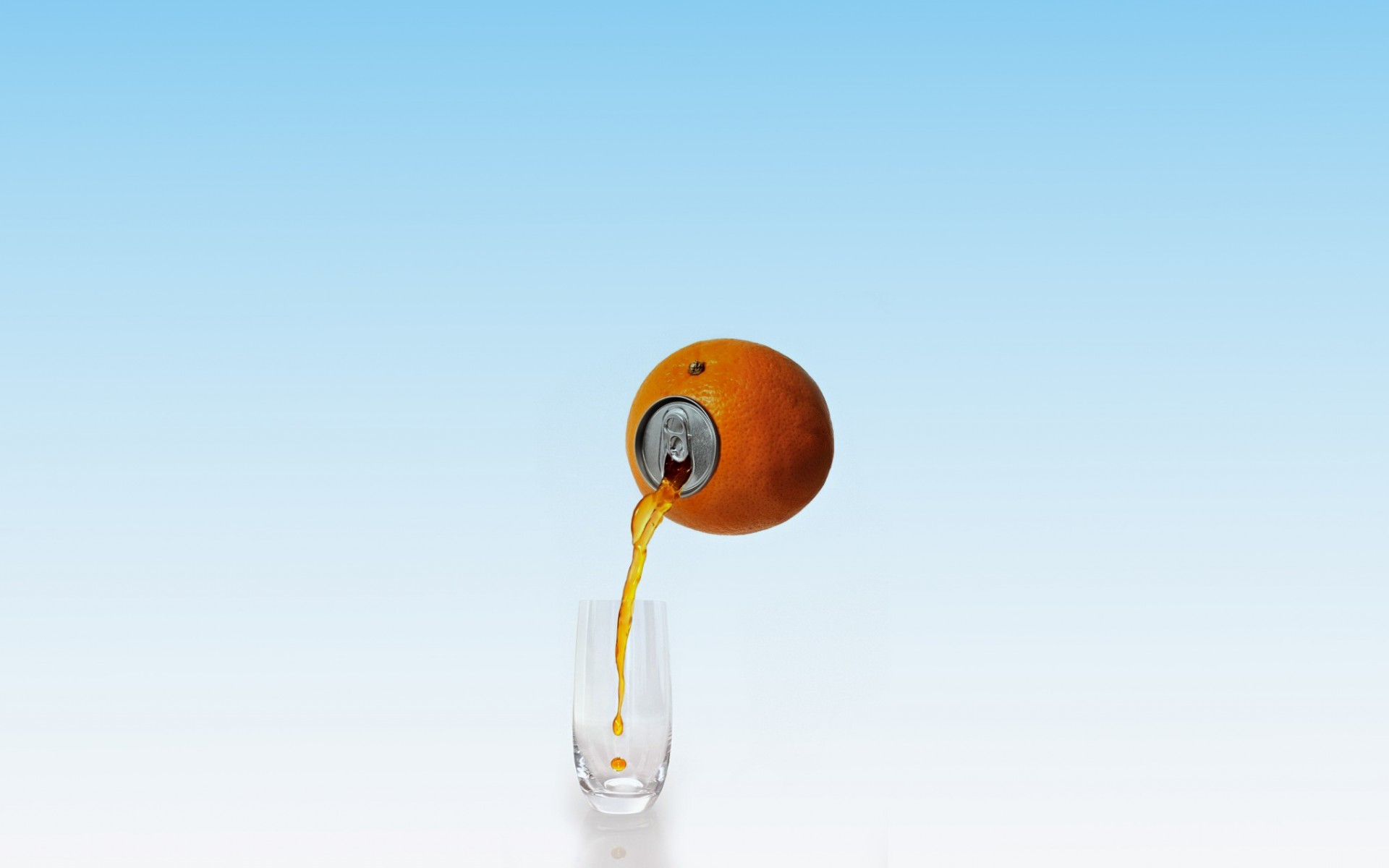 Description: A glass with a liquid pouring out of it and an orange in the middle of it.