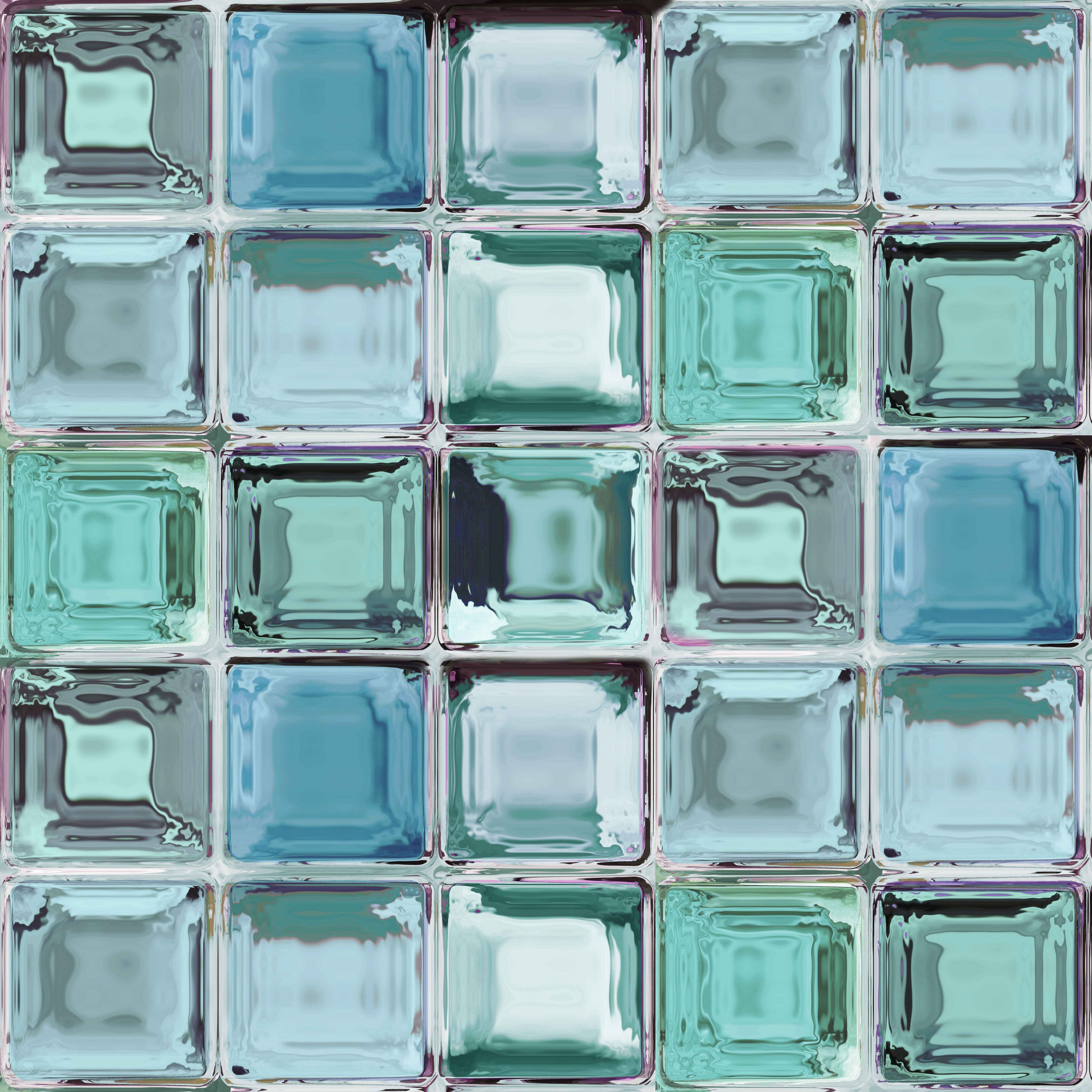 Description: A glass tile wall with a blue and green pattern on it's side and a black background behind it.