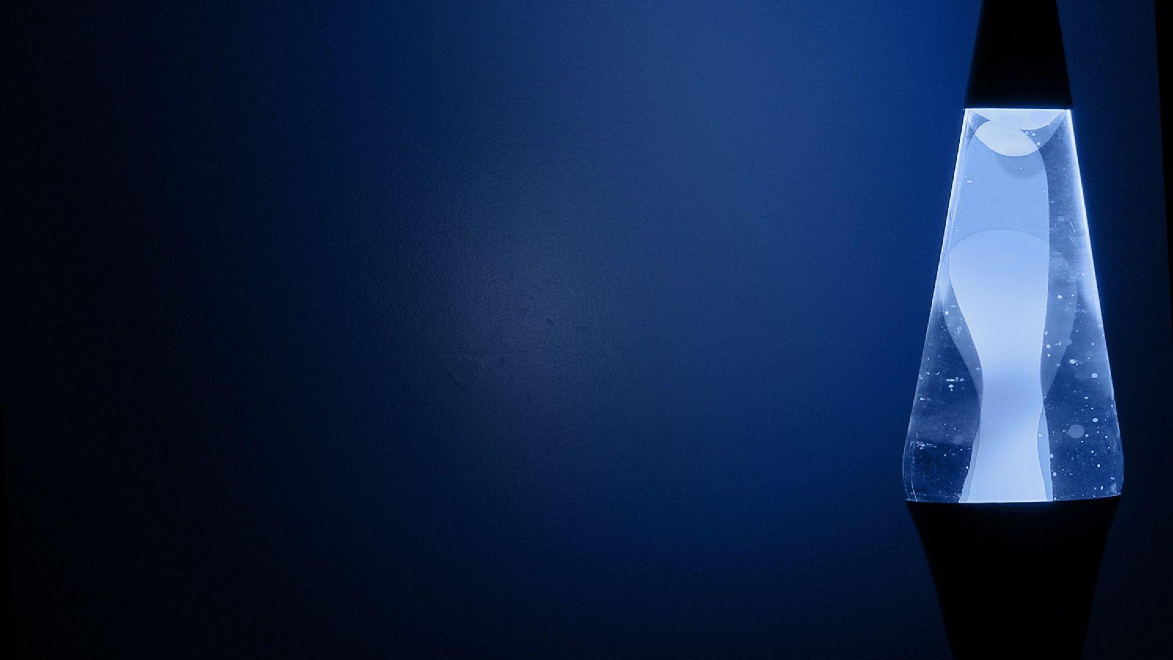 Description: A glass vase with a liquid inside of it on a table top next to a wall with a blue light.