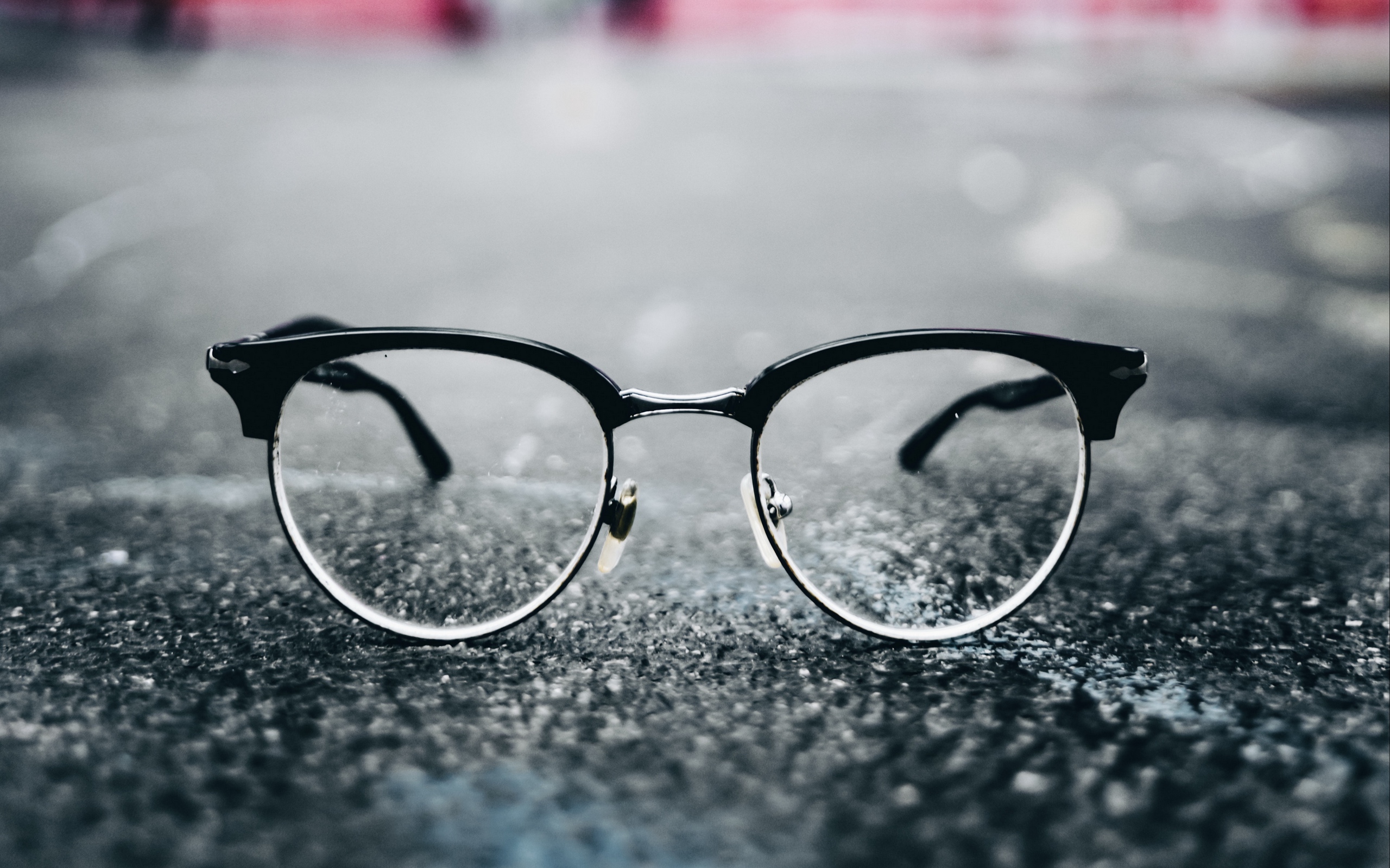 Description: A pair of glasses sitting on a table with a blurry background of a street and a building in the background.