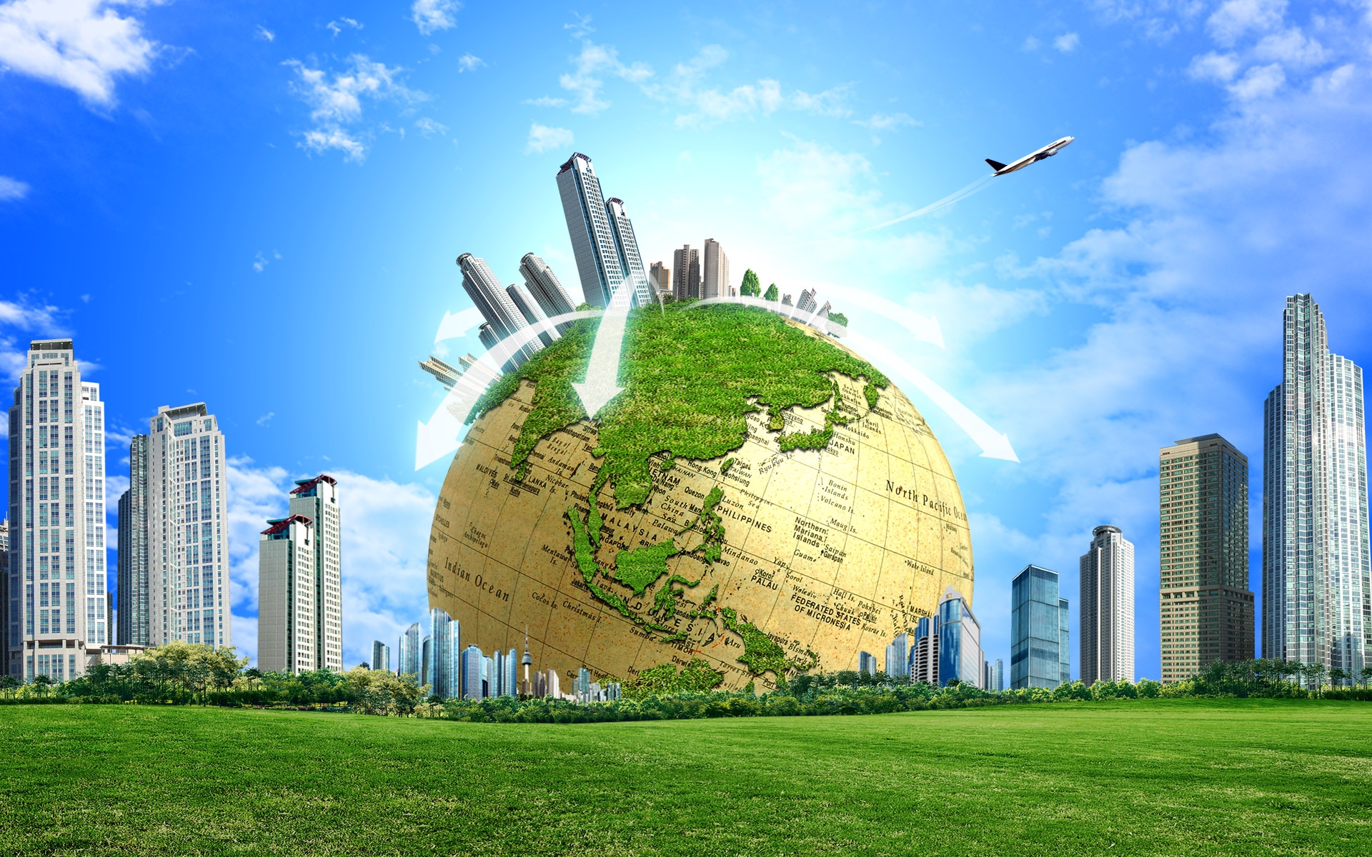Description: A picture of a globe with a city in the background and a bird flying over it in the sky.