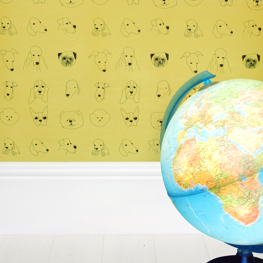 Description: A globe with a drawing of a dog on it in front of a wall with a pattern of dogs on it.