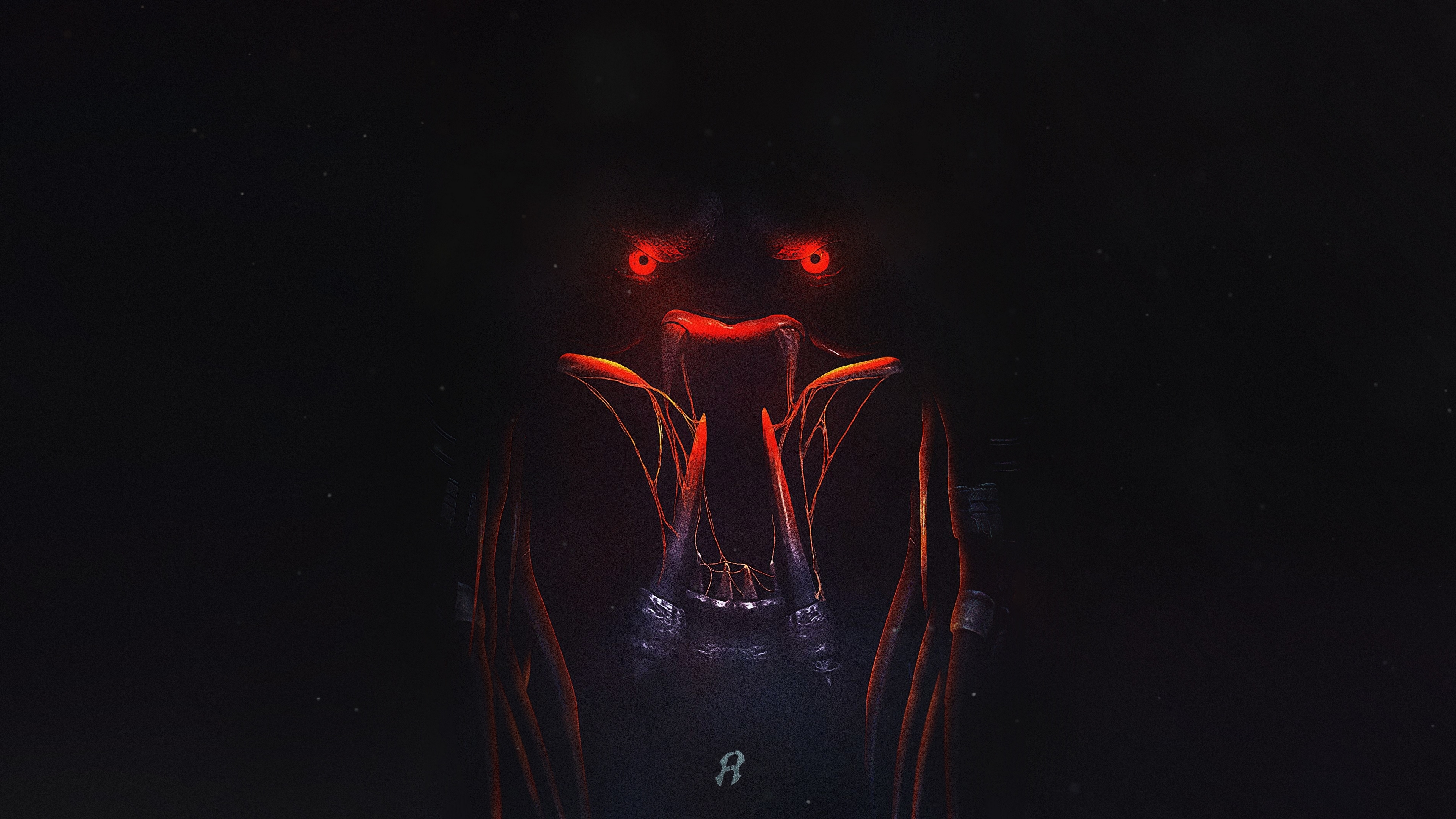 Description: A dark background with a red and black animal's face and eyes glowing in the dark.