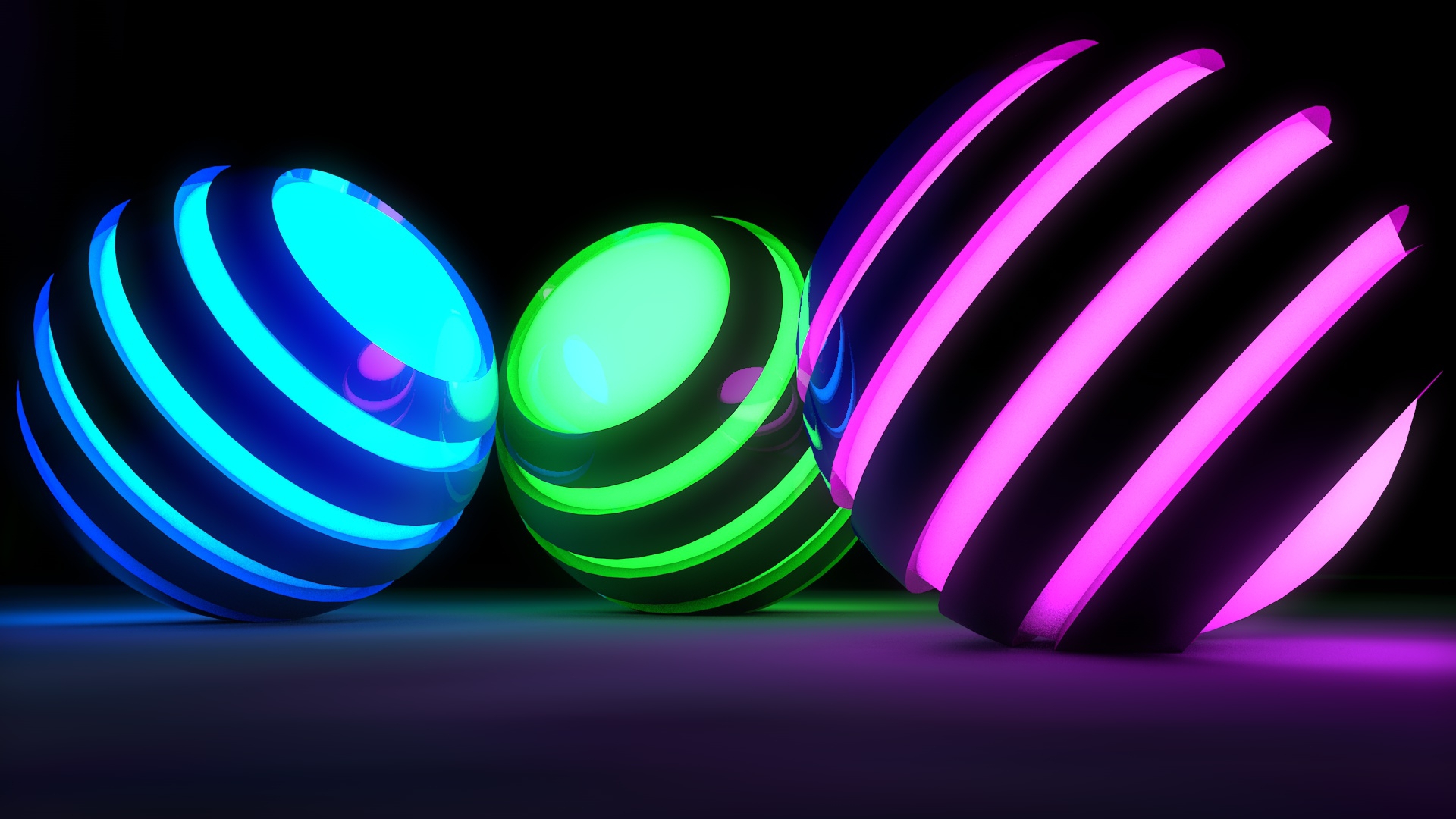 Description: Three glowing balls in a row on a black background with a black background and a purple and blue one.
