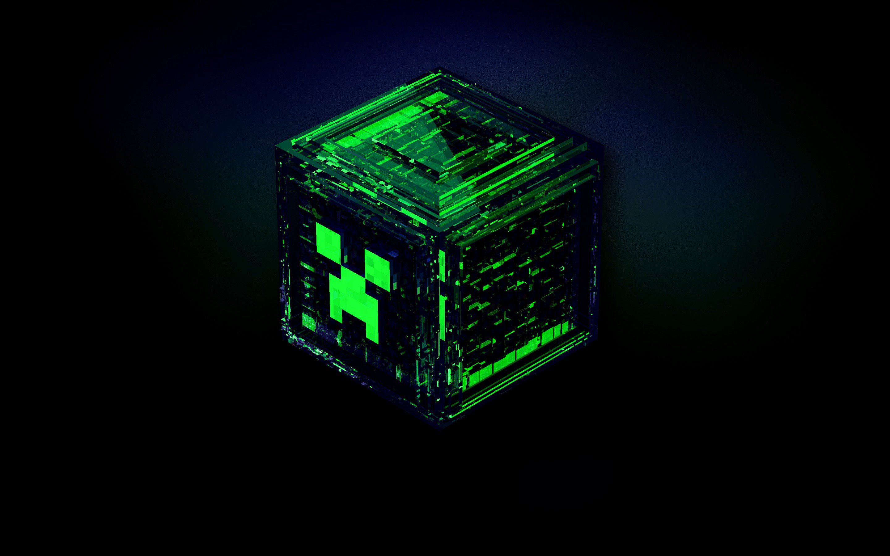 Description: A glowing green cube with a green cross on it's side on a black background with a green glow.