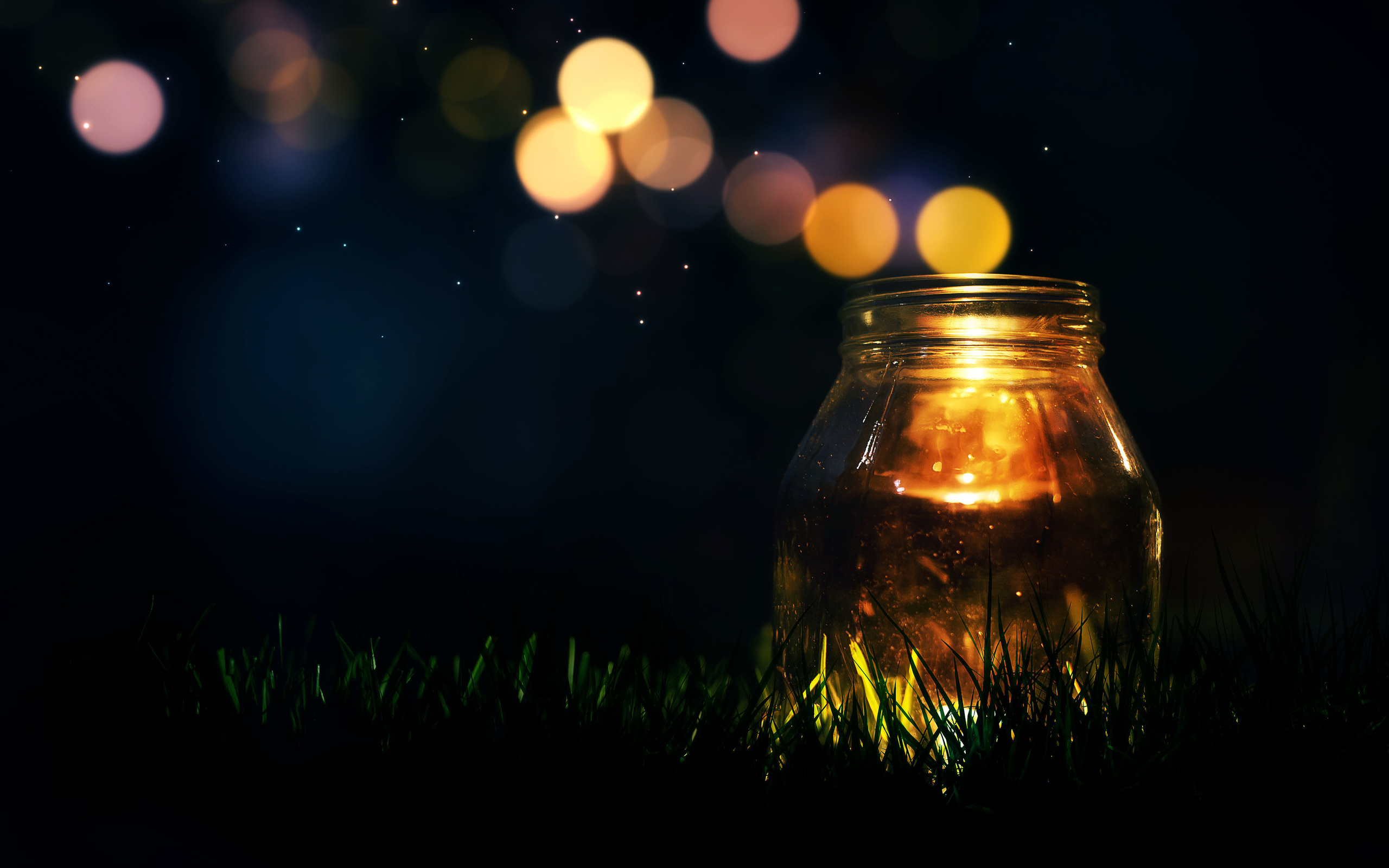 Description: A jar with a light inside of it sitting on the grass in the dark with boke of light.
