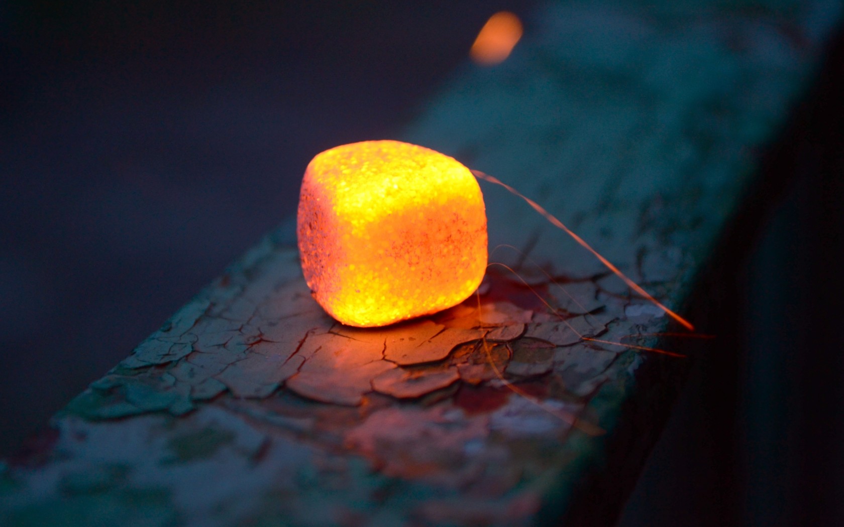 Description: A glowing object sitting on a piece of wood on a table top with a string attached to it and a glowing light in the background.