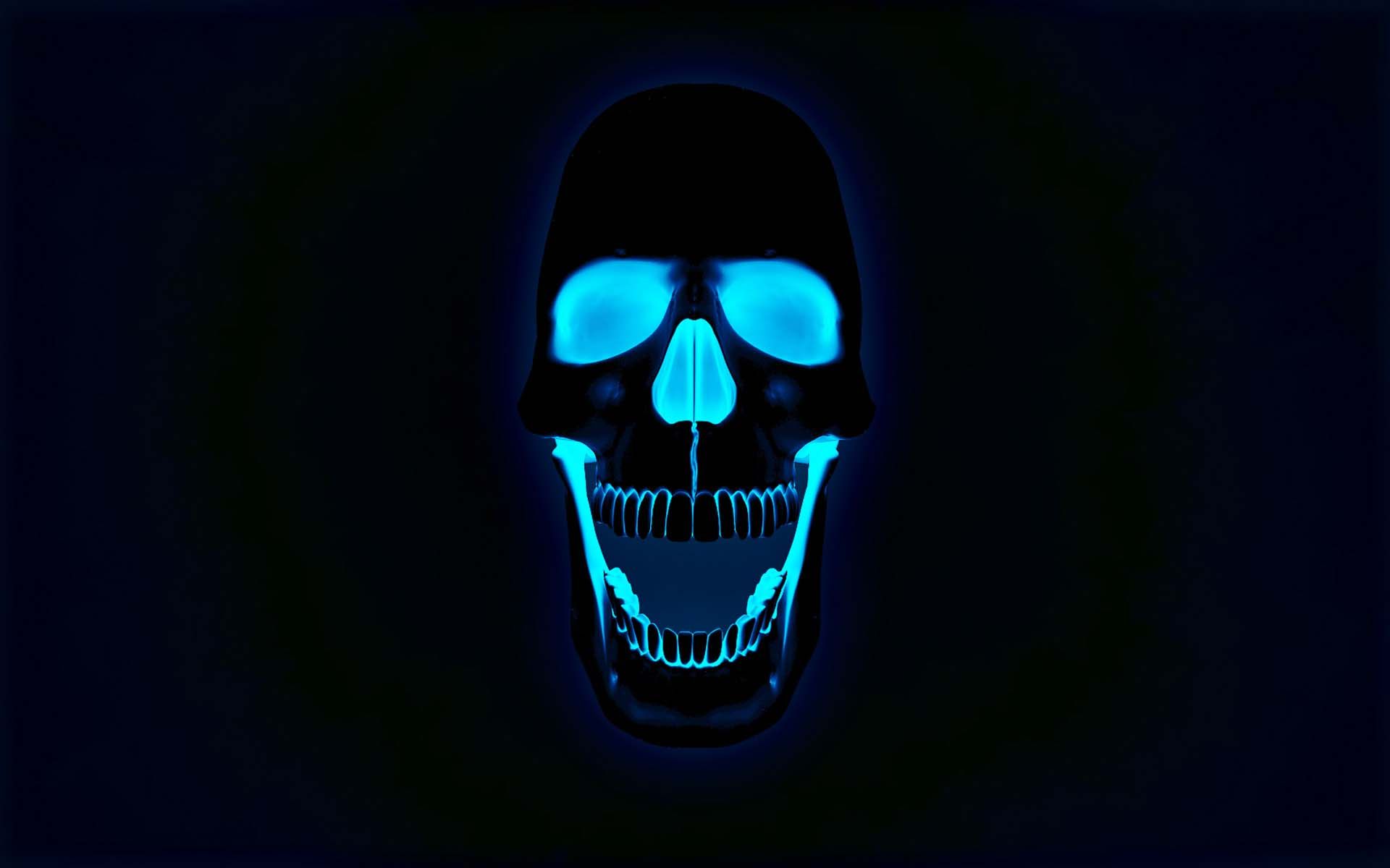 Description: A glowing skull with glowing eyes and a black background is shown in the dark with blue light coming from its eyes.