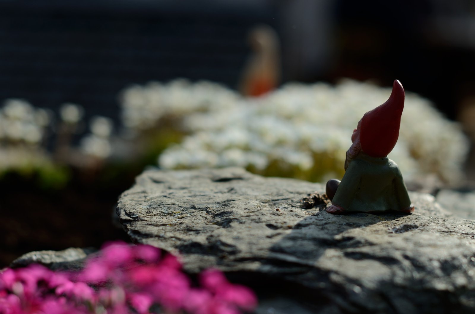 Description: A small gnome figurine sitting on a rock in a garden of flowers and rocks with pink flowers.