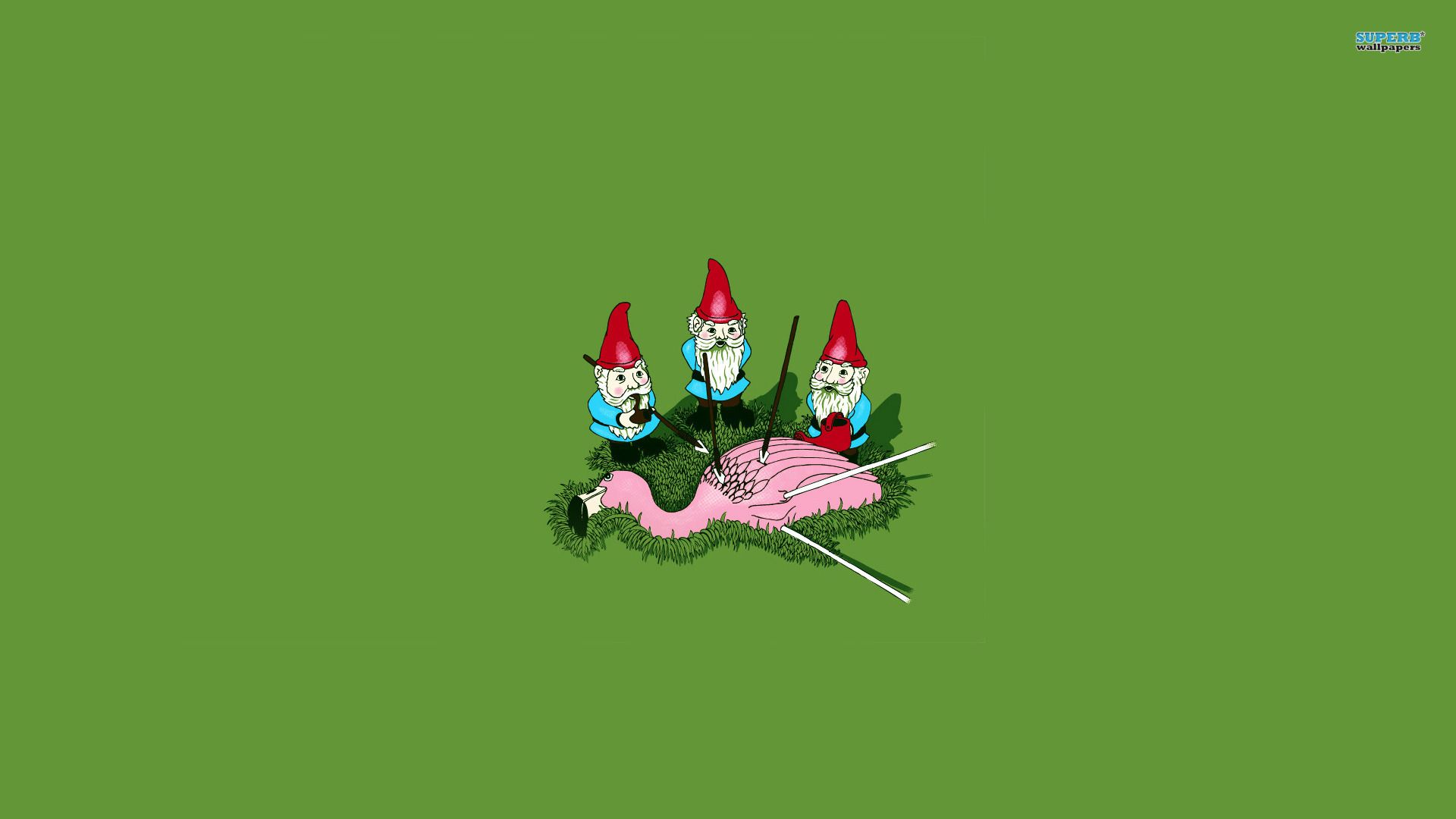 Description: A group of gnomes sitting on top of a pink flamingo on a green background with a pink flamingo.