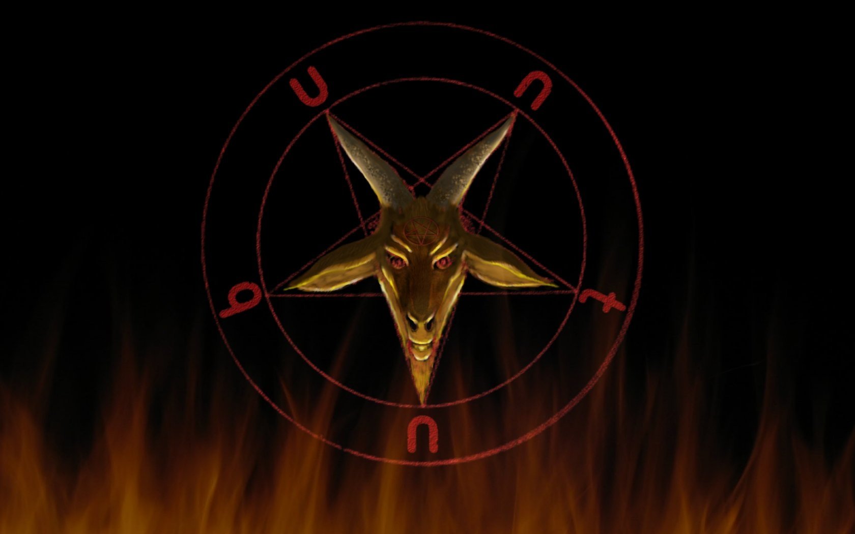 Description: A goat head with a pentagramus symbol on it in flames with a black background and a red pentagramus symbol.