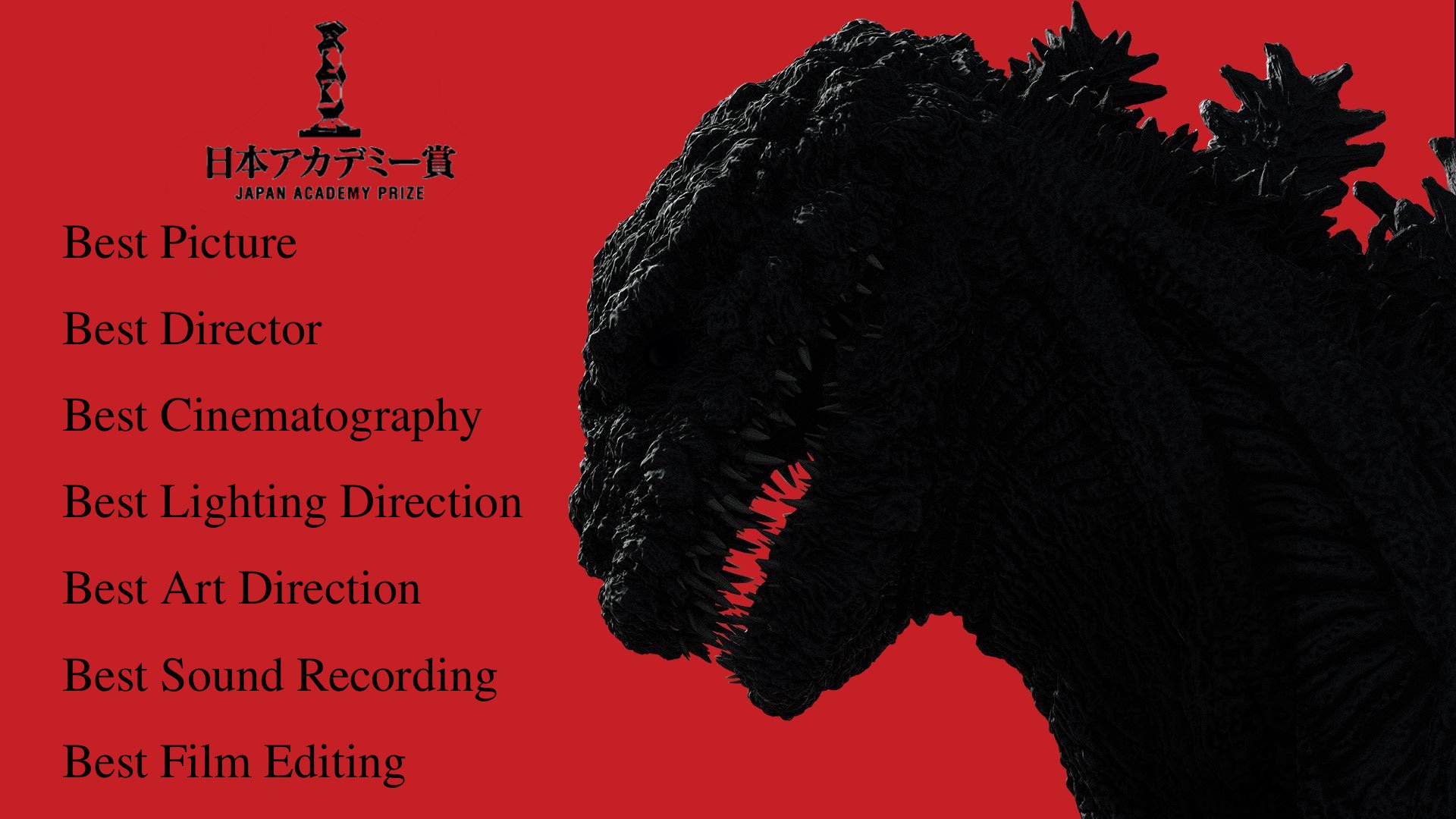 Description: A godzilla is shown in a red background with the words best picture best director best cinemagraph best lighting direction best sound recording best film editing.