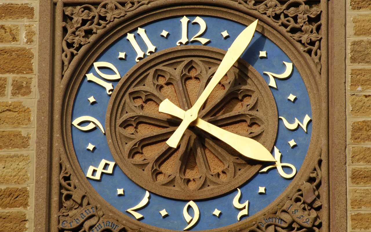 Description: A clock with a gold and blue design on it's face and numbers on the face of the clock.