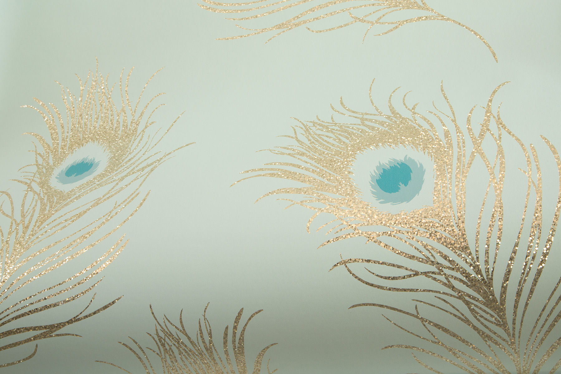 Description: A wall with a gold and blue design on it and a peacock feather pattern on it's side.