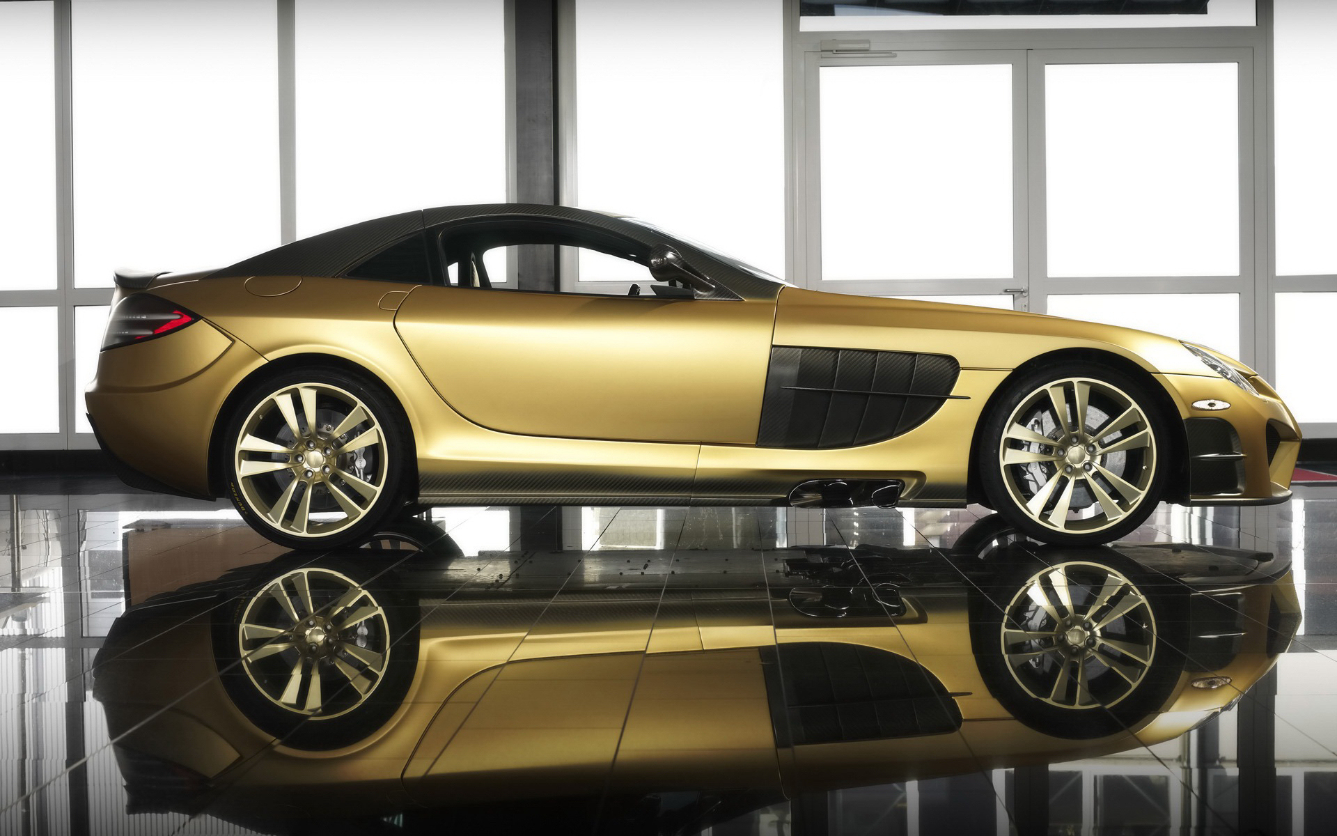 Description: A gold colored car is parked in a shiny room with a black floor and windows behind it is a reflection of the car.
