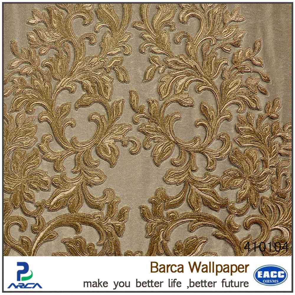 Description: A gold wallpaper with a floral design on it's side and a white background with a blue and green logo.