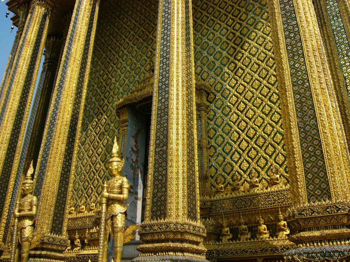 Description: A gold and green building with a clock on the side of it's face and a clock on the side of the building.