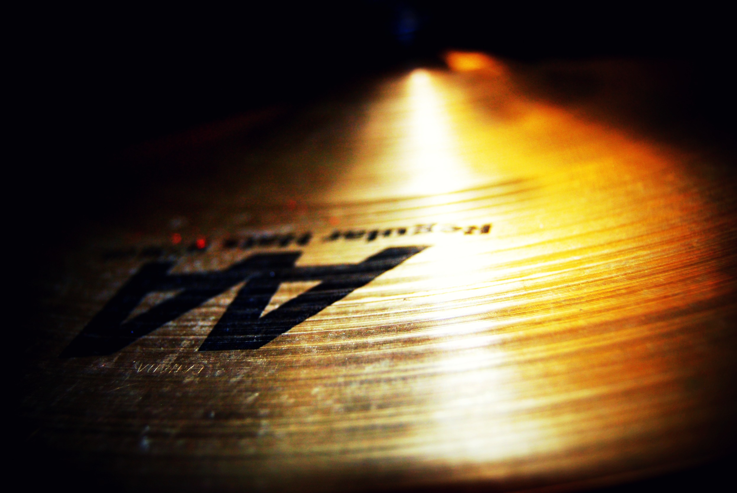 Description: A close up of a gold plate with a black and white logo on it and a light shining on it.