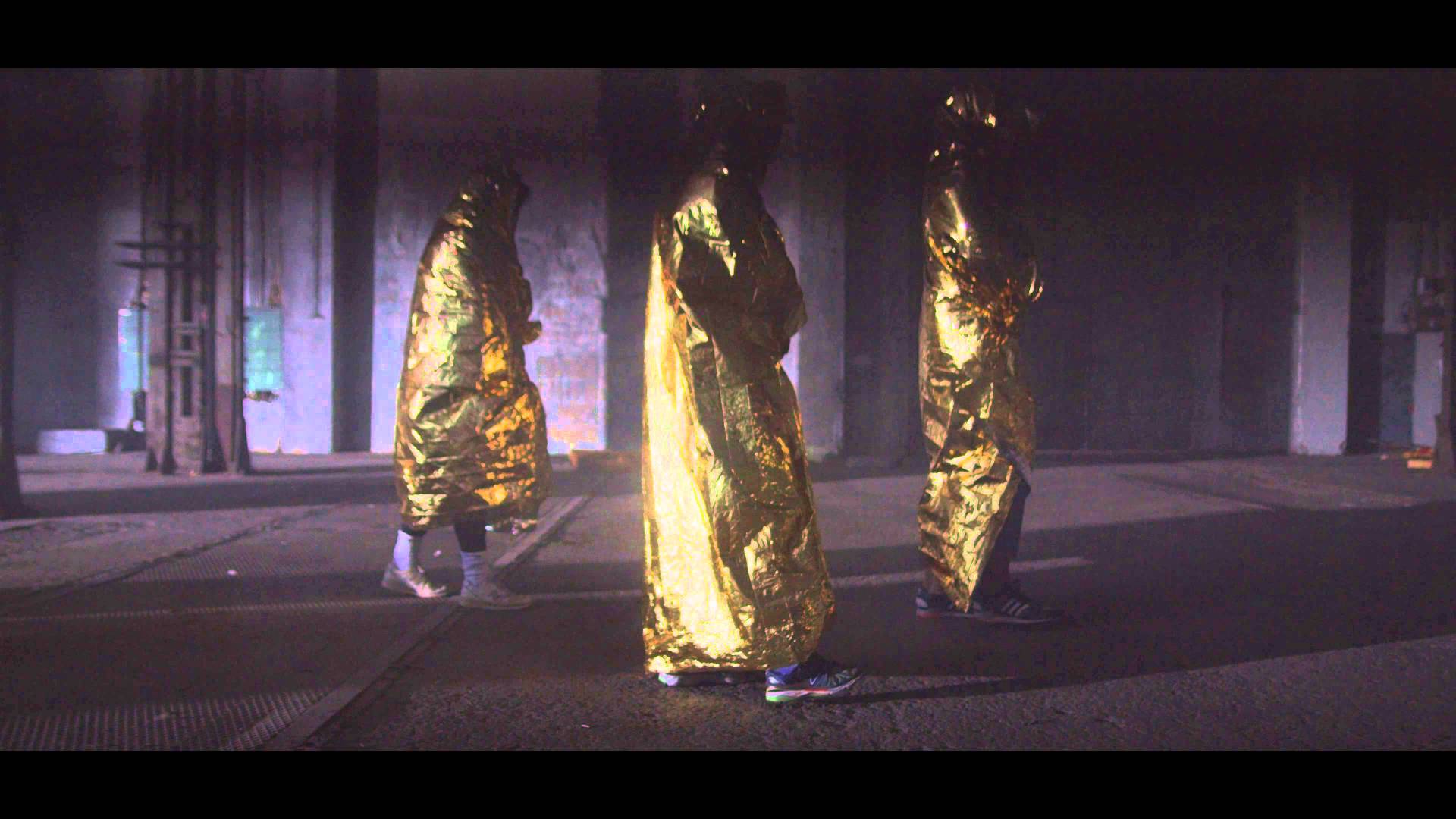 Description: Two people in gold raincoats walking down a street at night with a skateboard on the ground.