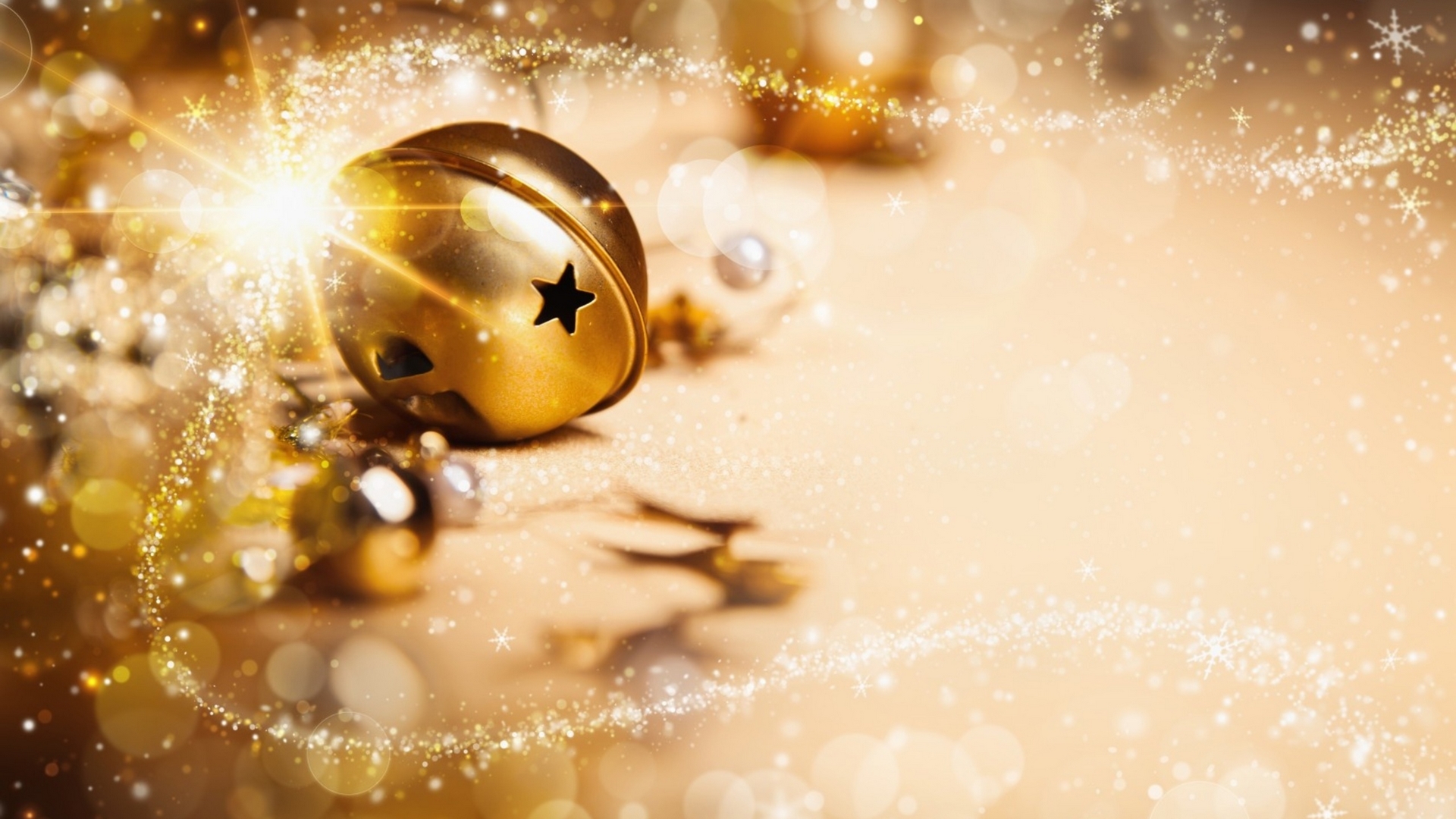 Description: A golden christmas ornament with a star on it and snow flakes around it on a brown background.