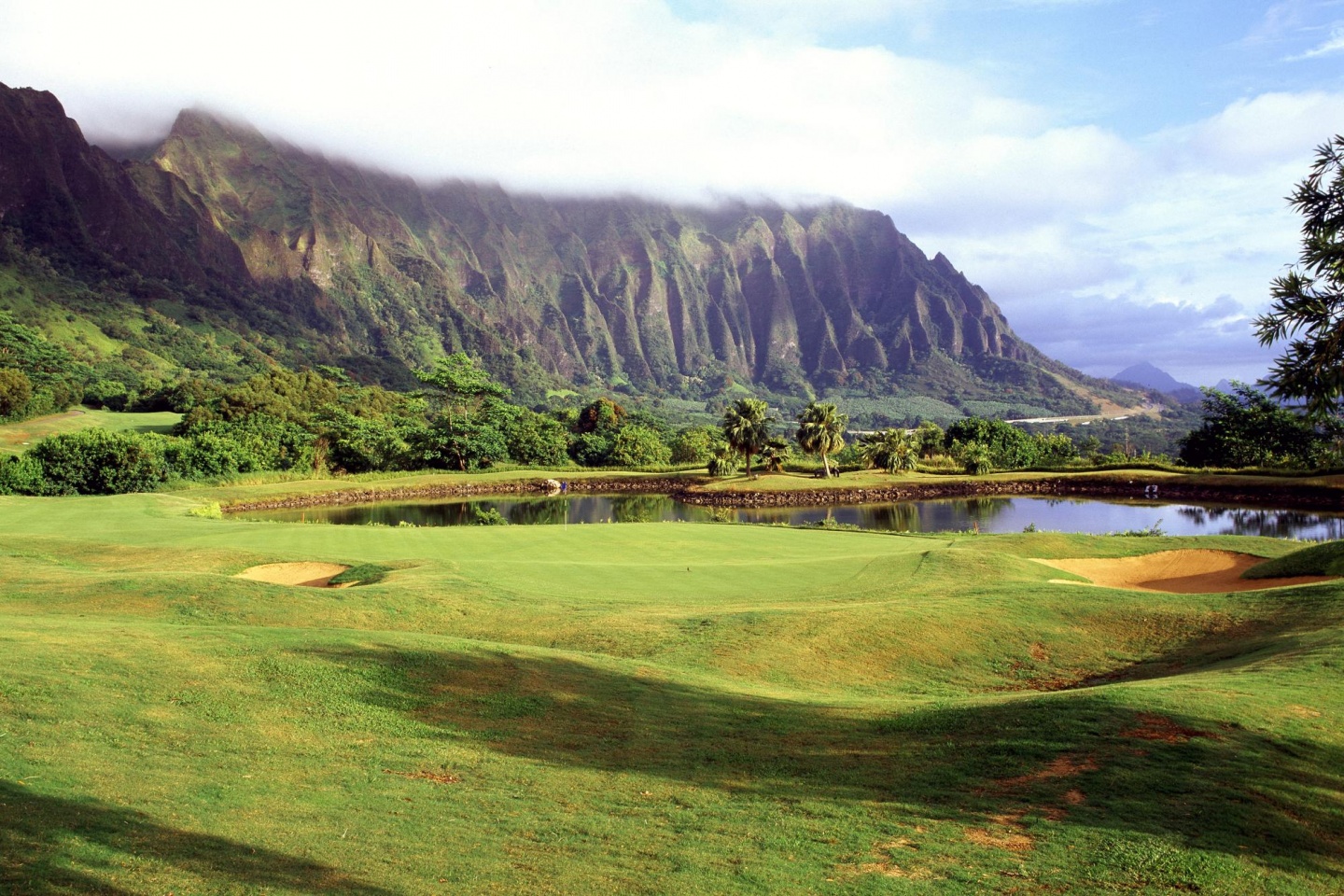 Description: A golf course with a mountain in the background and a lake in the foreground with a golf course in the foreground.