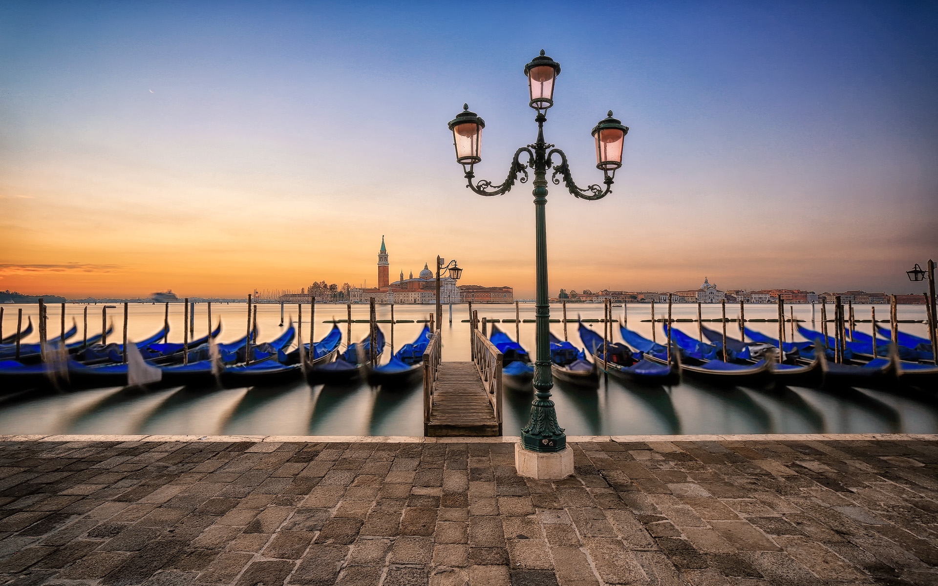 Description: A row of gondolas sitting next to a street light on a pier at sunset with a city in the background.