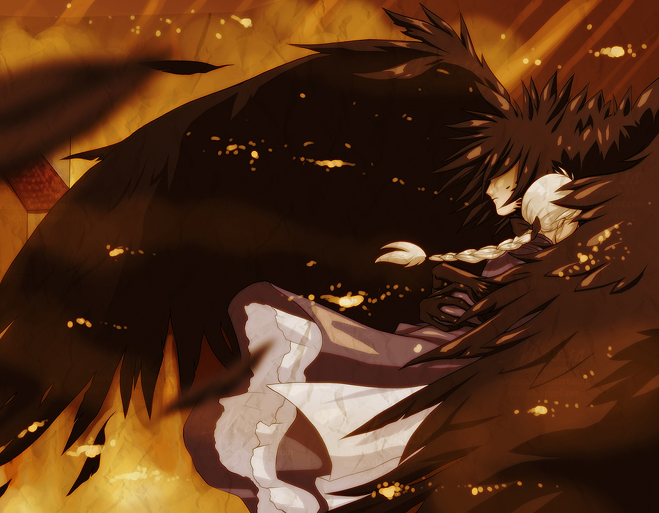 Description: A man with a black bird on his back in a fire filled room with flames and smokes behind him.